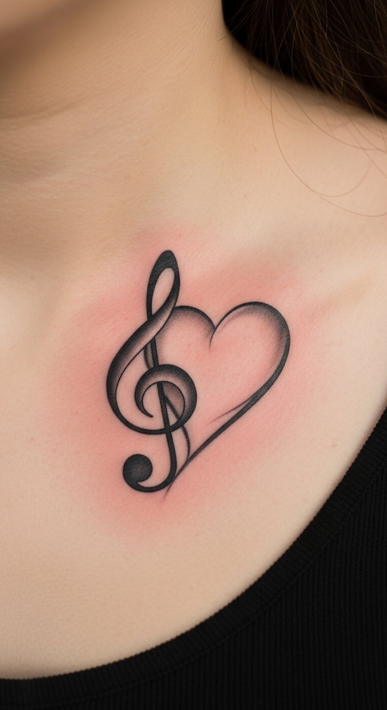 Blend a treble clef with a heart to express pure emotion. Practice with heart drawings at home—free tools abound. This design runs about $70.