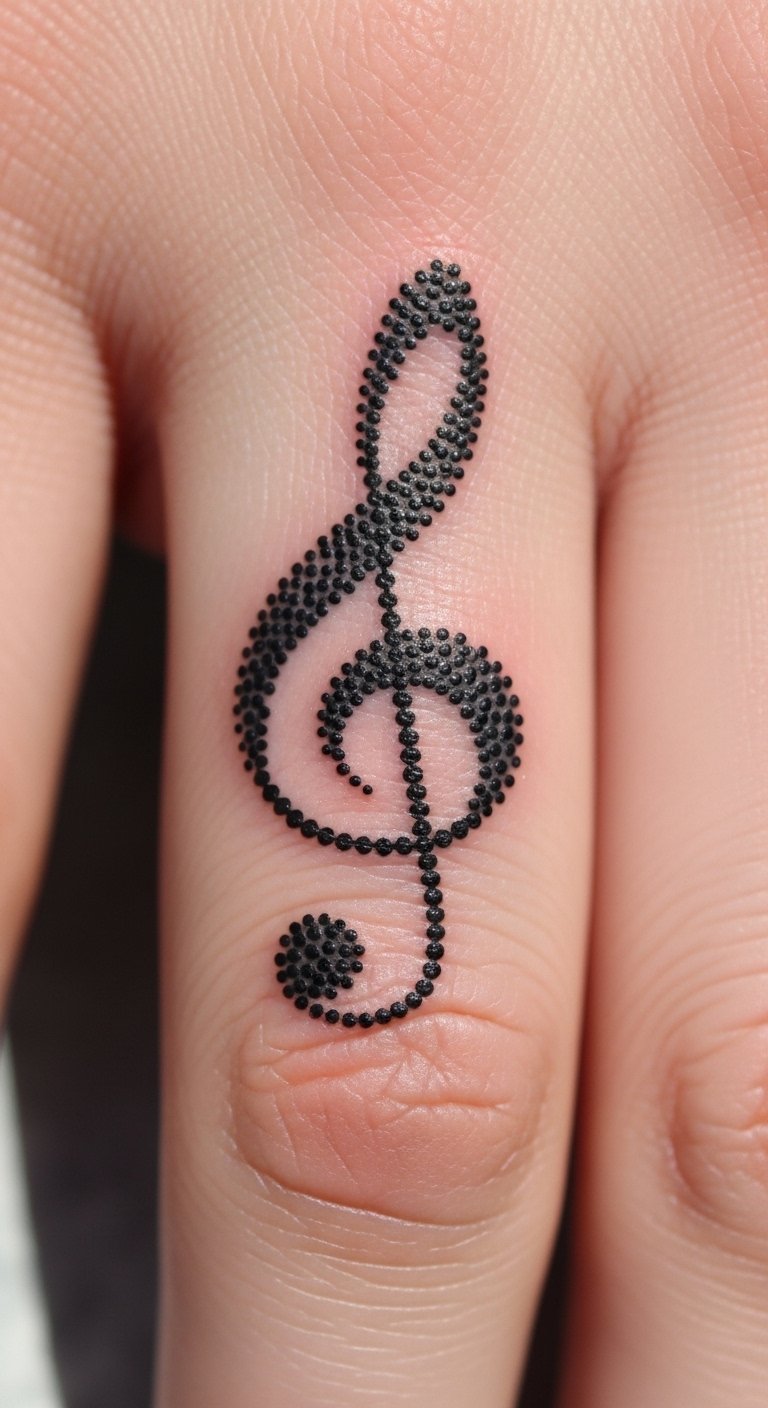 Use dotwork for your treble clef on the finger—tiny dots make it unique. Practice dots with a pen—free fun. Dot styles cost $30.