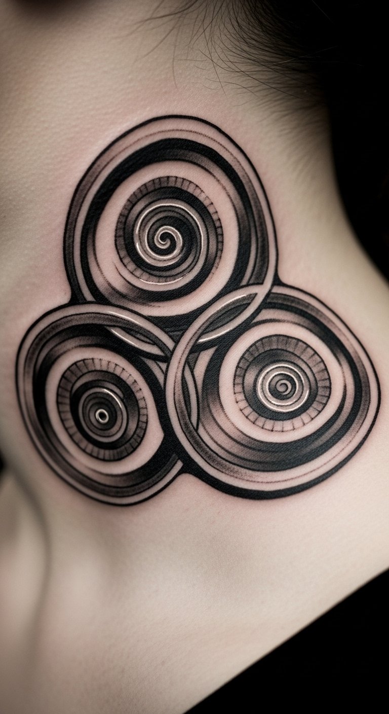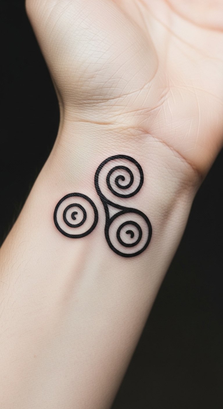 Think about a wrist tattoo with three smooth spirals. It fits daily life and shows quiet power. Start small with a local artist who uses basic tools. Save money by sketching ideas at home using free apps on your phone. Pick black ink for a timeless look. This design works for all skin tones. Get it in one session to keep costs low. Add a personal twist, like making spirals thicker. You can cover it with a watch if needed. Try drawing it on paper first to see how it feels. Keep the lines simple for easy touch-ups later.