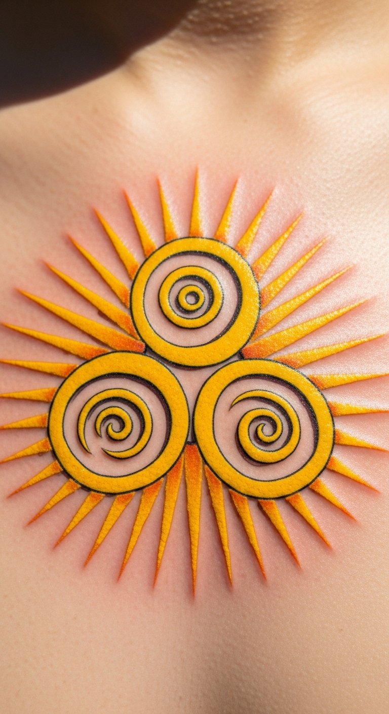 Burst out with sun rays on your chest triskelion. It’s uplifting and warm. Look for deals. Draw rays simply. Pick yellow hues. Quick setup. Customize the bursts. Shirts cover. Practice with sun drawings. Easy to maintain.