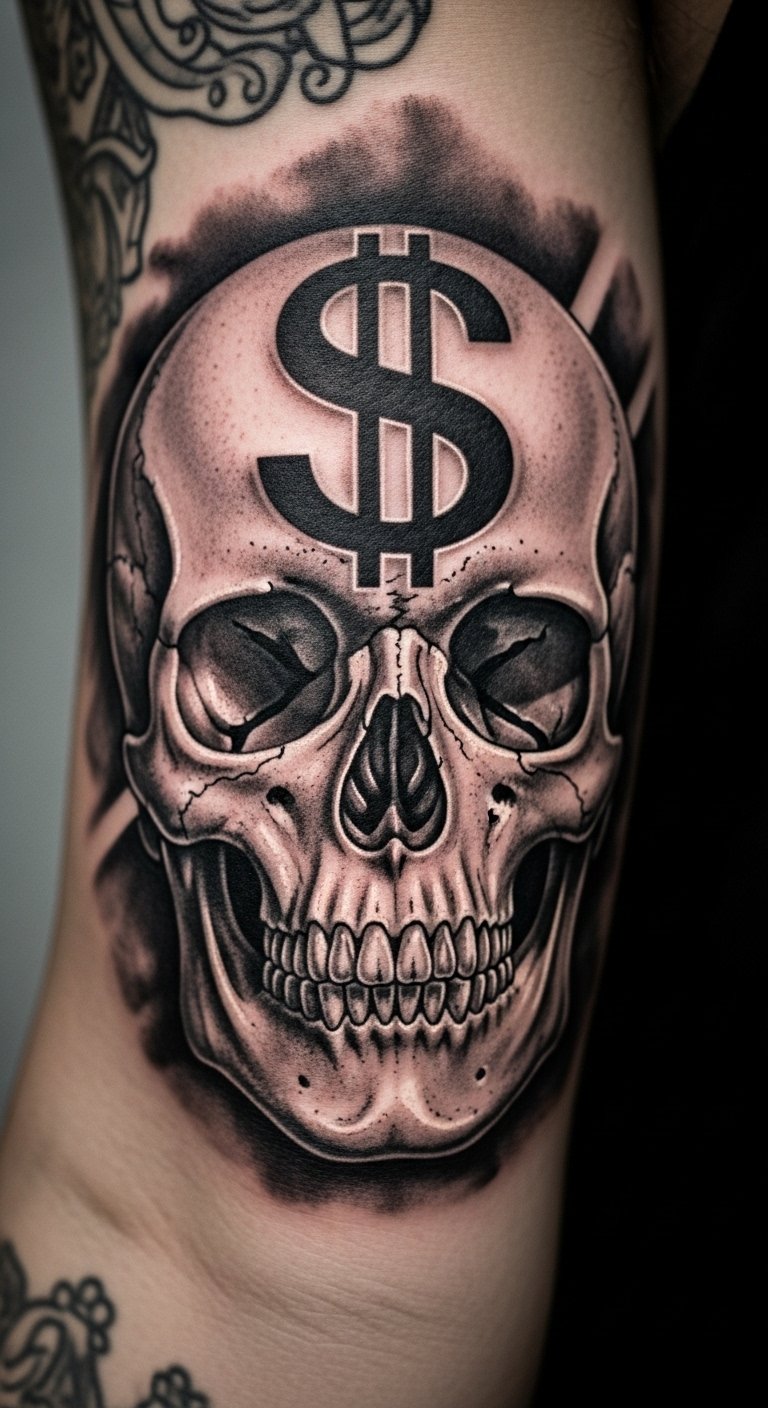 Tupac mixed wealth and death. Choose a small skull on your leg. Budget at $80–160. Sketch skulls yourself. Add dollar signs. Online options are free. Use temporaries. It’s a thoughtful, affordable design.