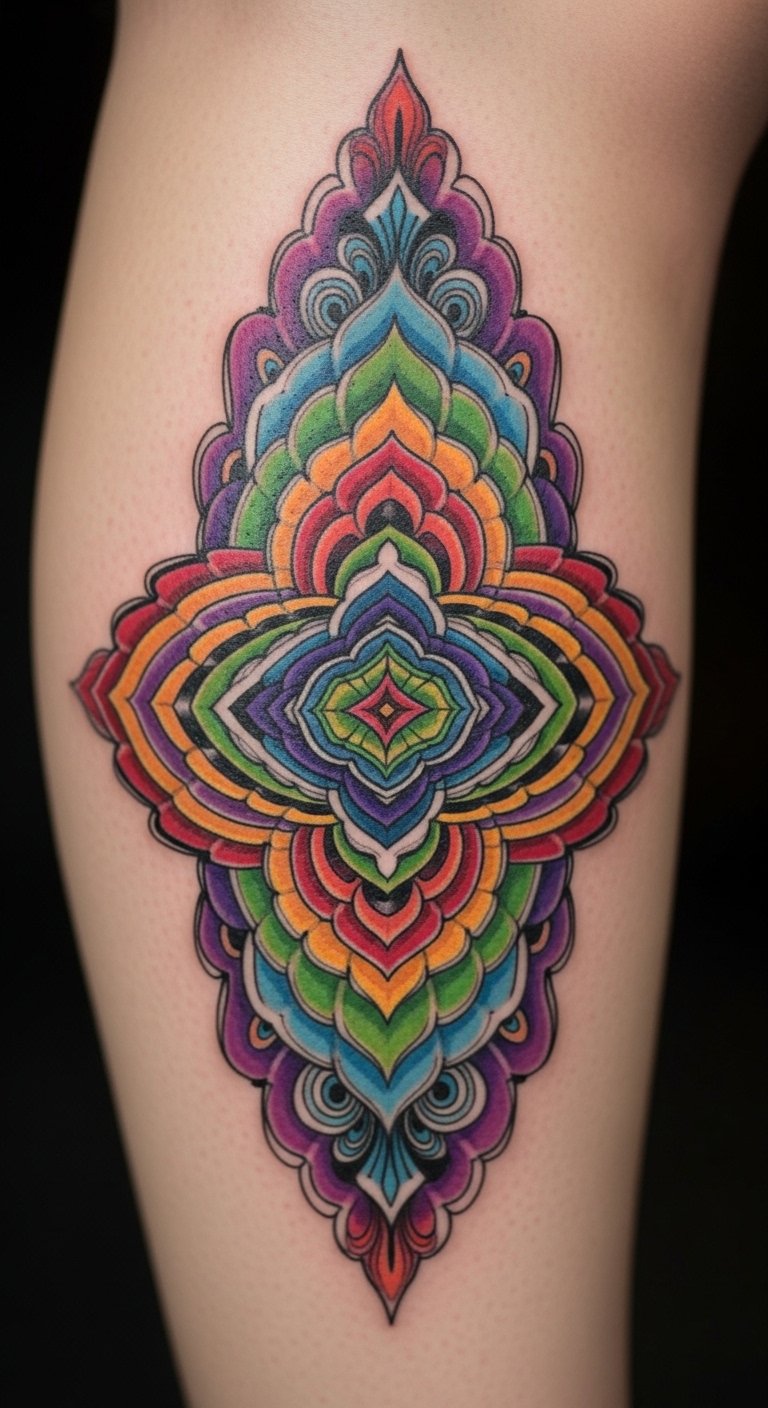 Use colors in your Unalome for a vibrant look. Hues add emotion and fun. This design pops. Search for color deals at $120. Try colored markers on paper. Blend shades yourself. Position on your leg. Paint a version at home. Buy colorful fake tattoos for $14. Apply and see. Discuss with artists.