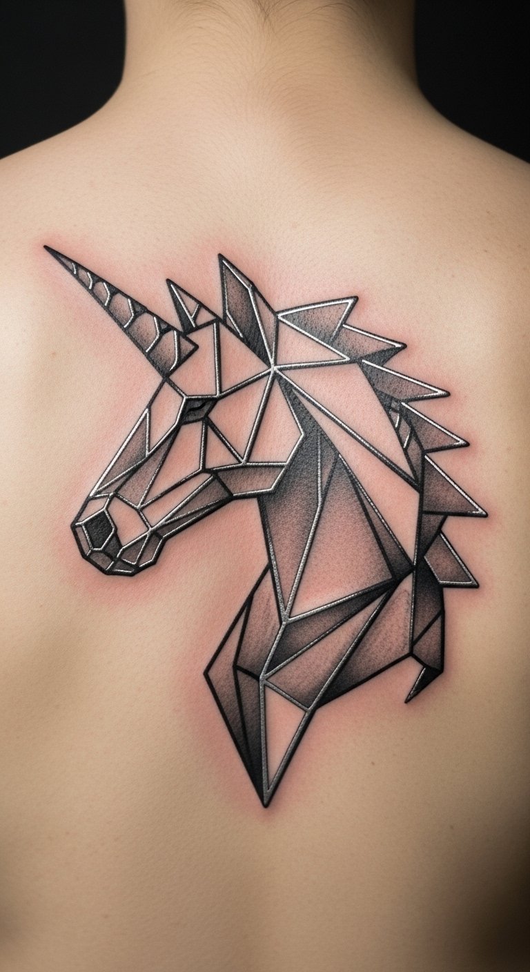 A geometric pattern unicorn mixes shapes like triangles and lines for a modern vibe. Imagine a unicorn made of precise angles that add edge to the myth. It’s great for those who love clean designs. Search for budget artists online; prices start at $100. Try drawing grids on paper at home to design your own layout. This DIY step makes the process fun and personal. Place it on your back for a larger canvas. Use bold lines to ensure it lasts. You’ll get a tattoo that stands out in a crowd.
