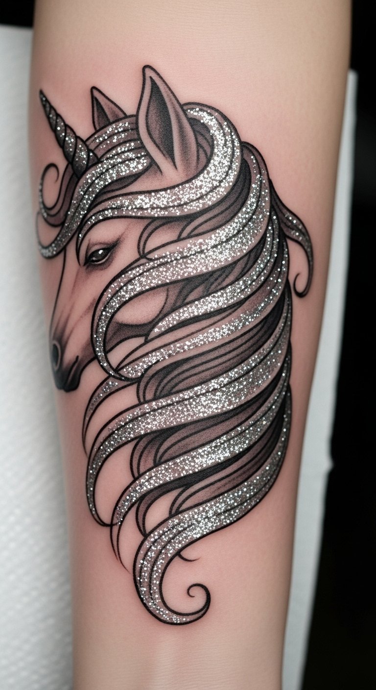 A glittery mane tattoo makes your unicorn sparkle with tiny flecks. Envision a mane that catches the light like real glitter. It’s perfect for adding flair to your design. Find deals on platforms like social media; expect $150 or less. Create a mock-up with loose glitter and body glue at home. This DIY method helps visualize the shine. Choose your forearm for a visible spot. Seal it well to maintain the glitter. You’ll have a tattoo that’s playful and eye-catching.