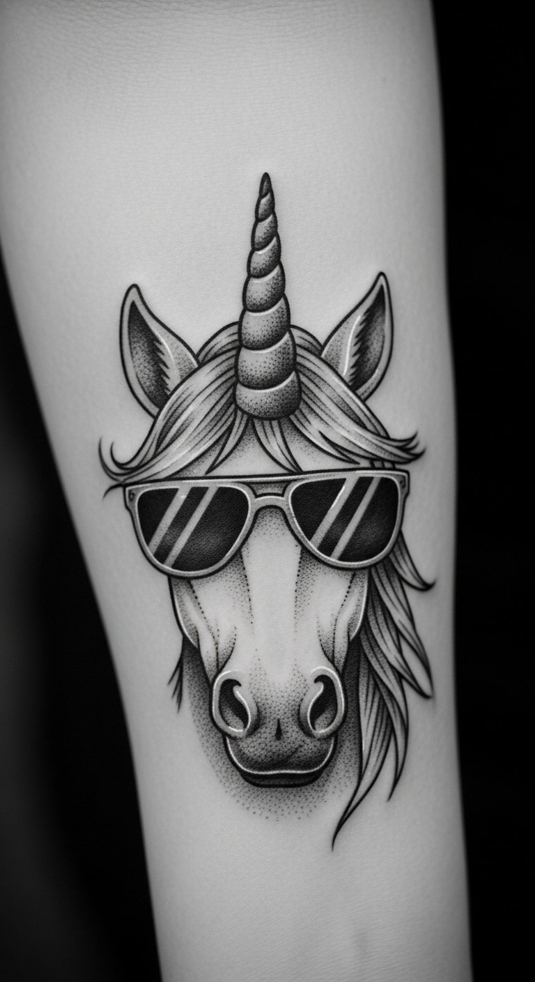 A sunglasses-wearing unicorn adds a fun, playful element to the design. Picture a unicorn rocking shades for a cheeky look. It’s perfect for a lighthearted style. Look for affordable custom options; about $140. Draw it with markers at home to test the idea. This DIY approach makes it engaging. Choose your forearm for visibility. Keep lines bold for durability. Your tattoo will make people smile.