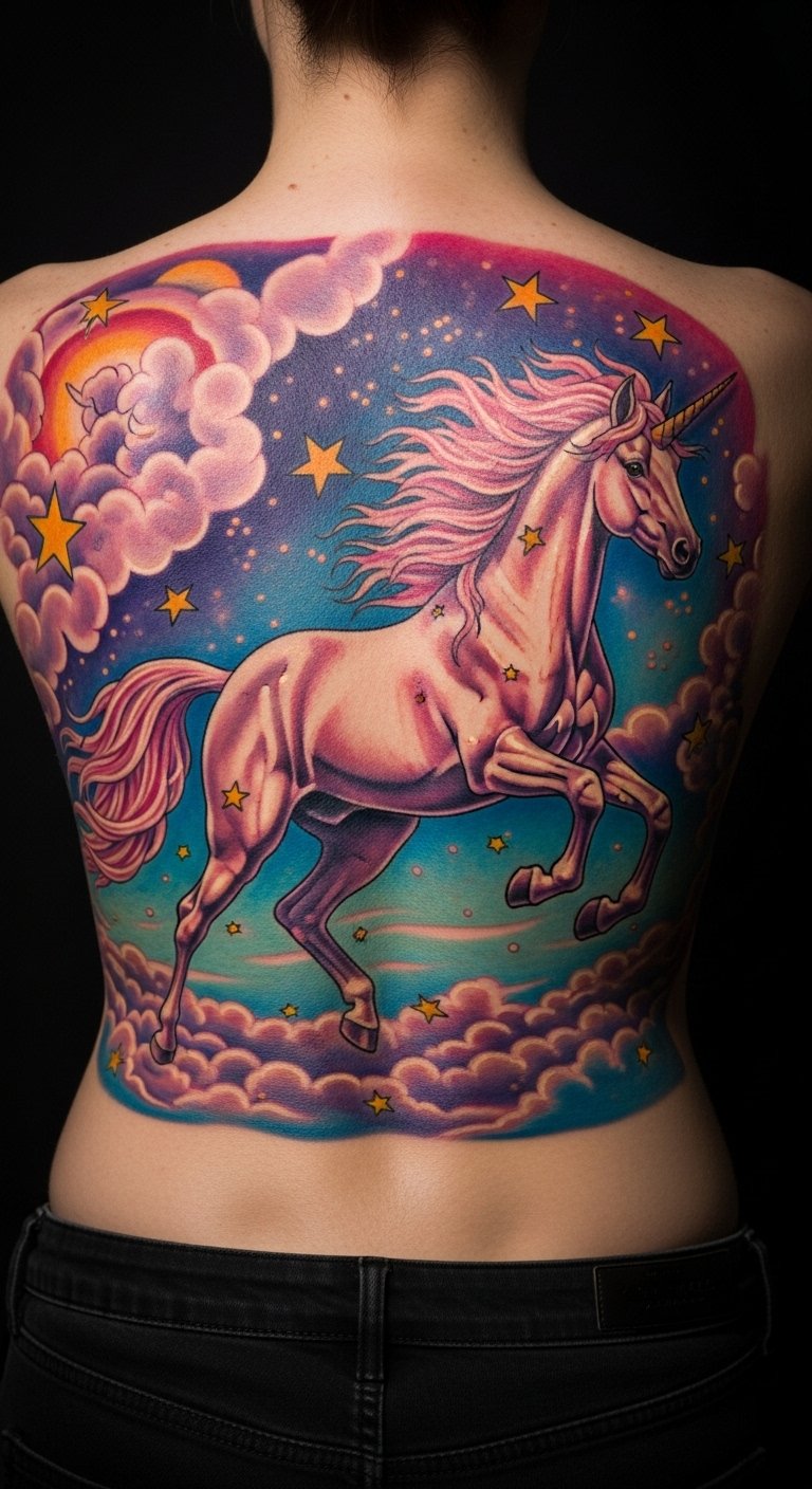 A back-spanning unicorn scene covers a big area with epic elements. Envision a unicorn running through stars. It’s perfect for bold statements. Look for package deals; around $300. Draw a rough layout on paper at home. This DIY step makes it personal. Use your back for the canvas. Opt for key colors to cut costs. You’ll have a tattoo that’s impressive and personal.
