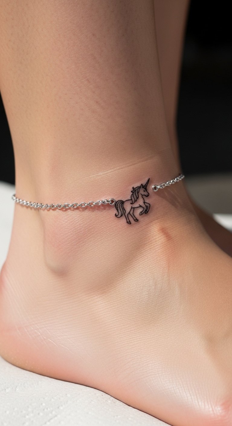 An ankle bracelet unicorn acts like jewelry on your skin. Picture a small unicorn in a chain design. It’s discreet and stylish. Find local artists; costs under $120. Make a bracelet mock-up with string and drawings at home. This keeps it budget-friendly. Place it on your ankle for elegance. Use fine lines for comfort. Your tattoo will add a subtle charm.