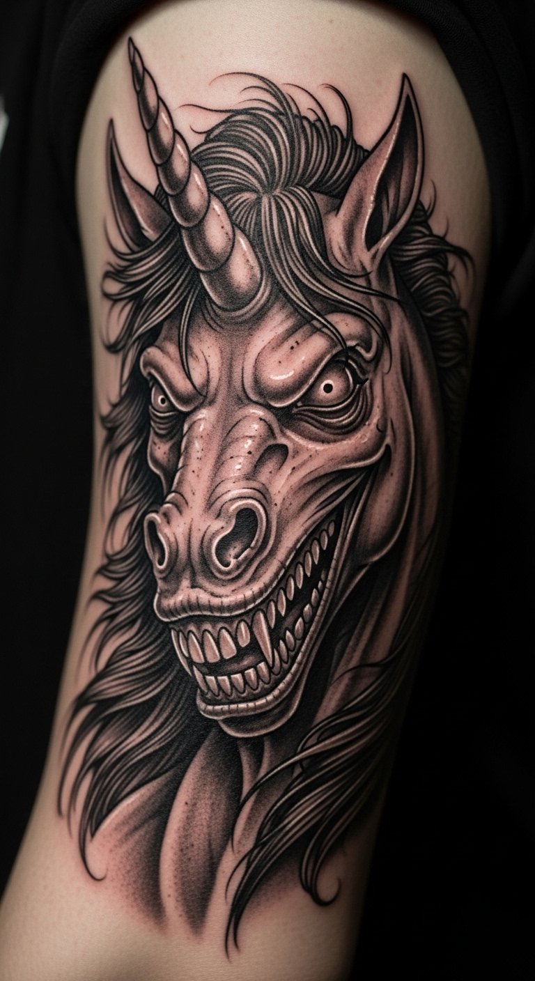 A creepy grimacing unicorn offers a darker twist on the myth. Picture a unicorn with a fierce face. It’s for those who like depth. Search for specialized artists; around $180. Sketch grim faces on paper for a DIY start. This adds a personal layer. Place it on your arm for expression. Use shading for intensity. Your tattoo will tell a deeper story.
