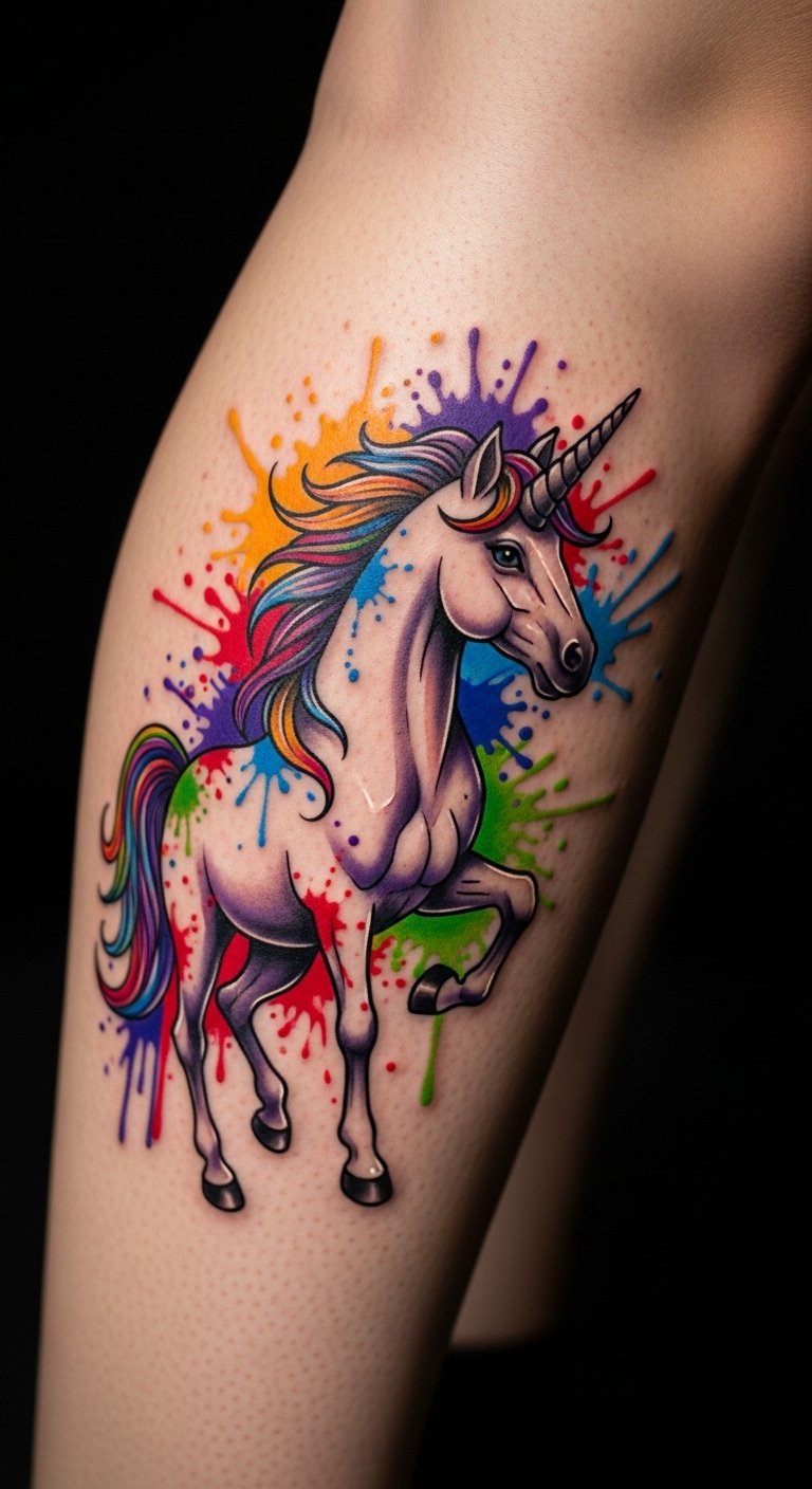 A whimsical paint splash unicorn uses splatters for a artistic look. Imagine paint drops around the beast. It’s fun and creative. Look for deals; about $160. Experiment with paint at home for ideas. This DIY approach is engaging. Put it on your leg for space. Keep colors bright for pop. Your tattoo will feel like art.