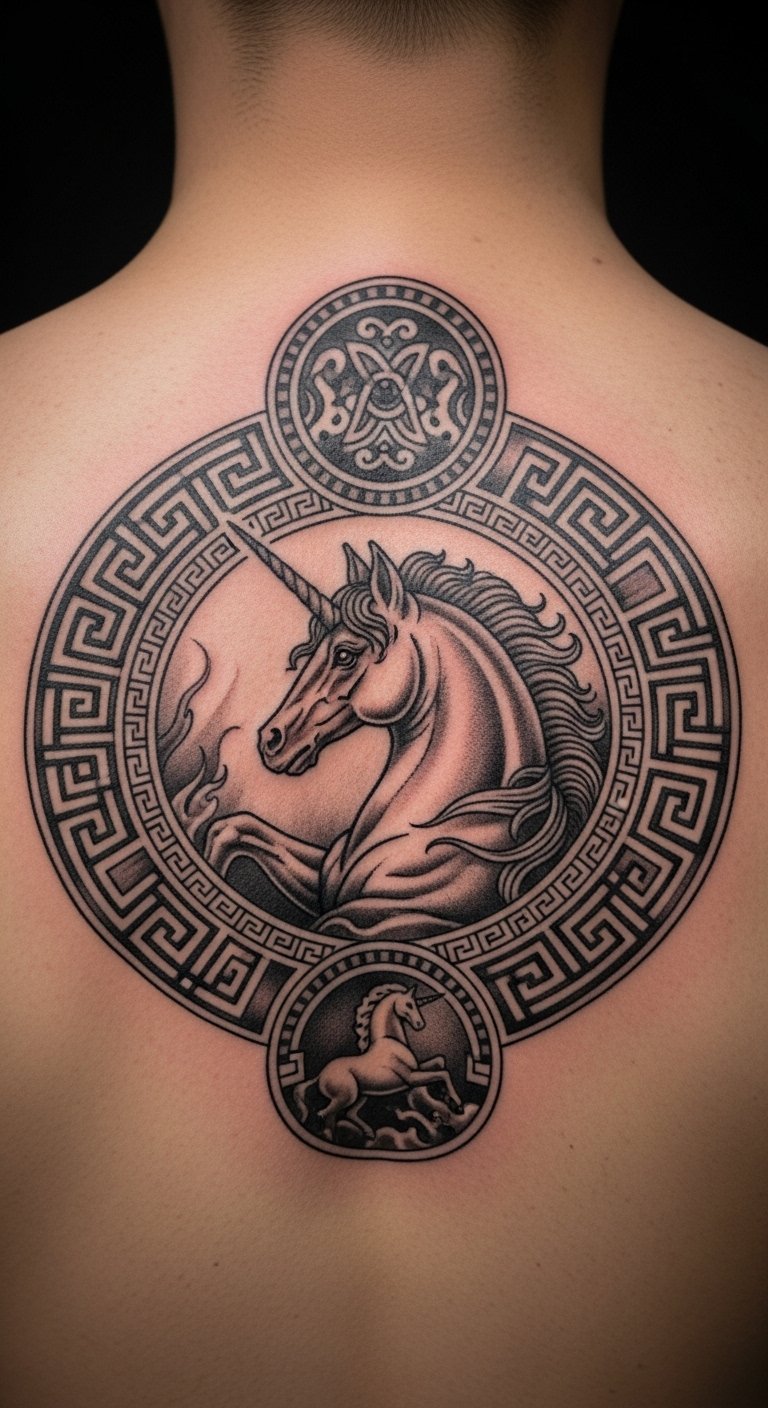 A cultural Greek myth unicorn draws from history for a timeless feel. Think of ancient patterns with the unicorn. It’s great for heritage fans. Find cultural artists; around $220. Research and draw myths on paper at home. This makes it educational. Place it on your back for detail. Use traditional inks for authenticity. Your tattoo will connect to the past.