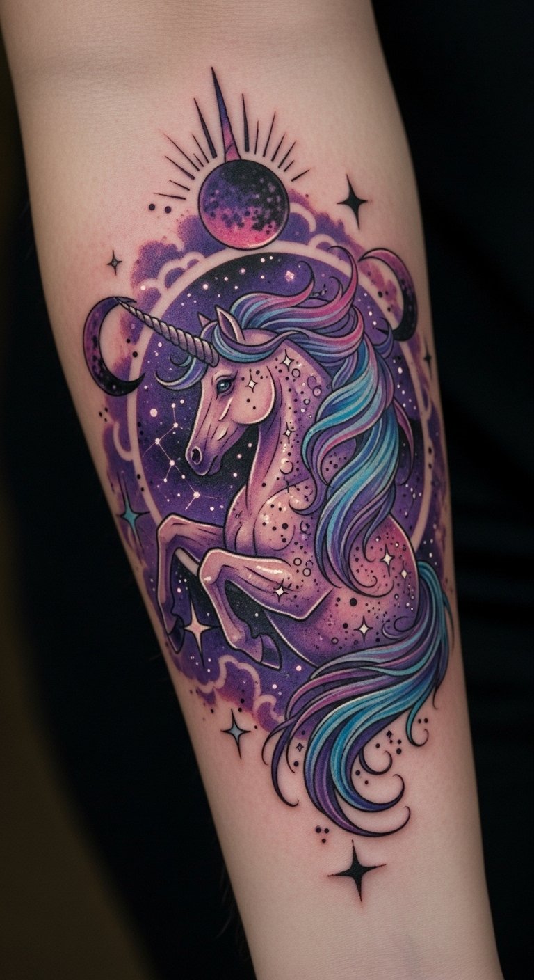 Fantasy elements with stars make your unicorn magical with celestial adds. Picture stars and moons orbiting. It’s ideal for dreamers. Look for themed artists; around $150. Draw fantasy scenes at home for fun. This keeps it affordable. Place it on your forearm for visibility. Blend elements smoothly. Your tattoo will spark imagination.