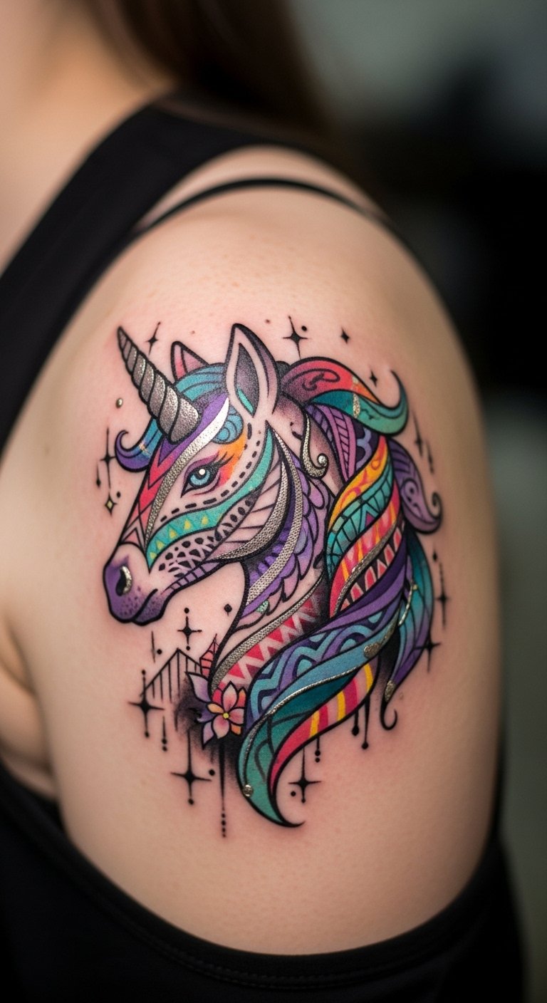A star-studded unicorn design adds cosmic elements for a dreamy feel. Envision stars around the unicorn. It’s perfect for night lovers. Find budget sessions; expect $140. Create star patterns with stickers at home. This keeps costs low. Put it on your shoulder for flair. Blend stars seamlessly for effect. Your tattoo will shine bright.