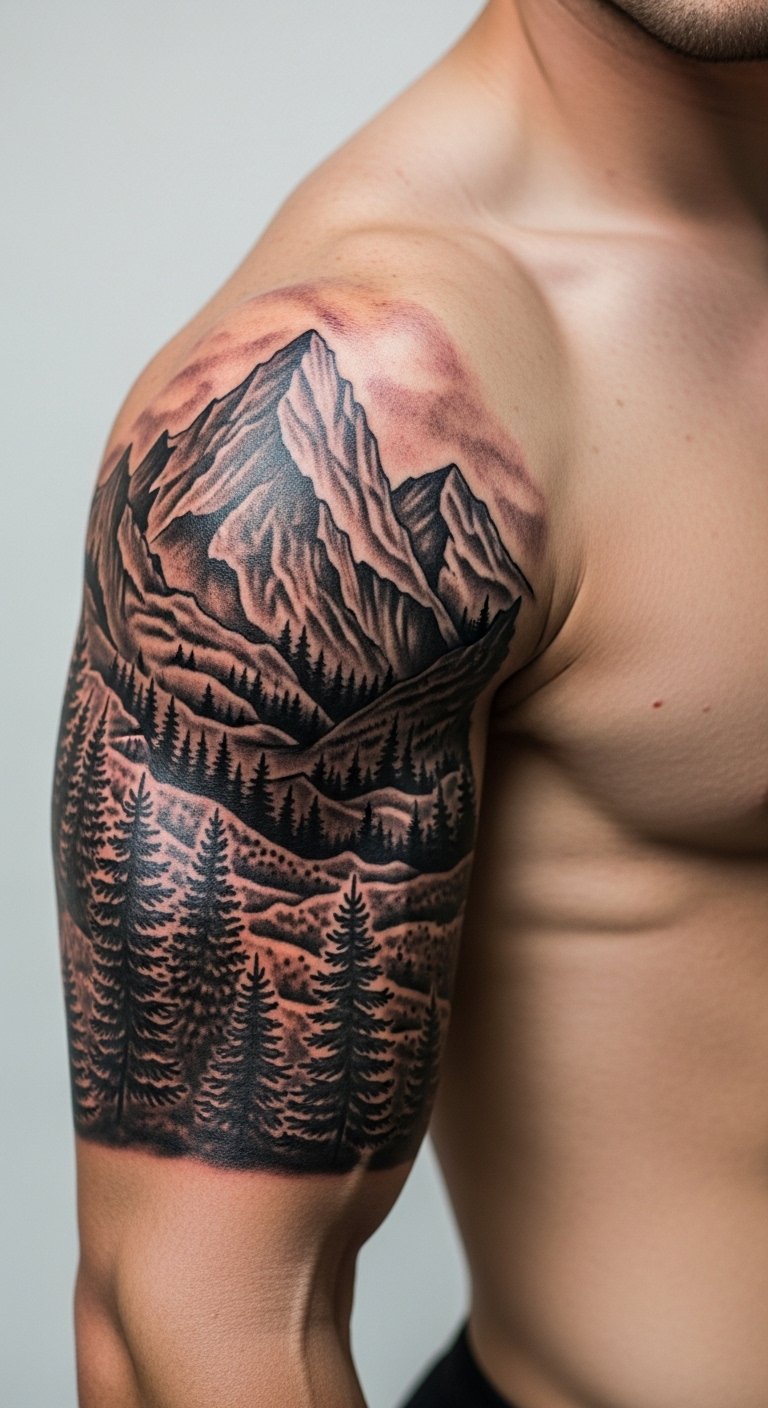 Mountains on your arm bring the outdoors right to you. This nature-inspired sleeve builds a story from peak to base, covering your upper arm for a cohesive feel. Sketch ideas from hiking photos you already have, saving on custom art. Use phone apps to layer elements like trees and rocks before committing. Budget around $150–200 for a basic version at a nearby studio. Opt for black and grey to cut costs and boost longevity. Try temporary tattoos first to test the placement on your daily outfits. Add small details, like a compass, using simple drawing tools at home. It fits well under long sleeves for office wear. Schedule sessions in phases to manage any mild discomfort. Maintain it with sunscreen to slow fading, grabbing cheap options from the store. This tattoo evolves with you, staying fresh for years.