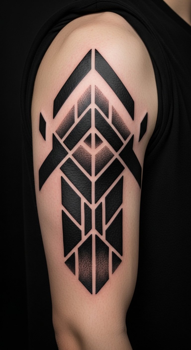 Blackout ink with geometric cutouts creates a striking, modern edge. This design covers old tattoos or starts fresh on your upper arm for a clean slate. Draw basic shapes on paper to plan your layout, keeping it simple and personal. Free design tools online let you tweak patterns without extra fees. Expect to spend $100–150 for a small area at a budget shop. Choose geometric lines to make it easier and cheaper to apply. Test with henna or markers on your arm to check visibility. Place it where sleeves can hide it for professional settings. Break the tattoo into smaller sessions for quick, painless visits. Use lotion regularly to keep the ink vibrant, picking up affordable brands. This style adapts to your lifestyle, fading less over time.