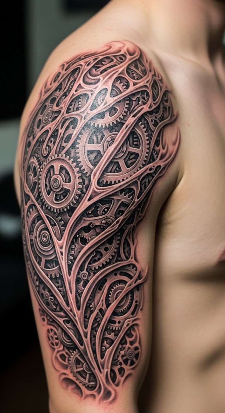 Mix machines with your body for a sci-fi twist. Gears blending into veins on your upper arm add a personal, futuristic touch. Start by sketching gears from everyday objects like watches. Online templates help you combine elements at no cost. A basic design runs about $120–180 at a local artist. Go with simple lines to keep expenses down and the look sharp. Practice on paper to see how it wraps around your arm. Position it for easy cover with a jacket during meetings. Opt for shorter appointments to handle the process smoothly. Protect it with basic moisturizers to maintain the details. This tattoo stays relevant, requiring only occasional checks.