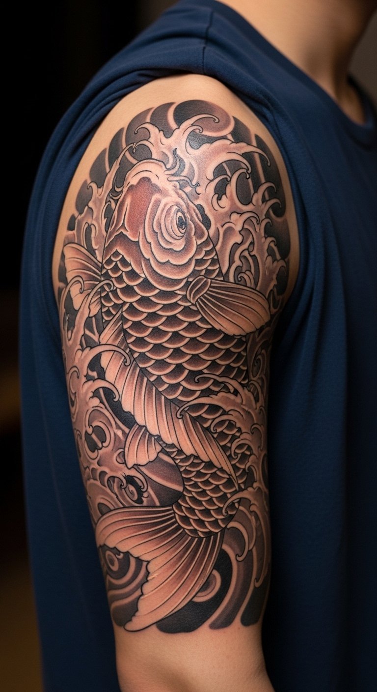Koi fish symbolize strength and flow on your upper arm. This design swims across your skin with waves and curves. Draw fish from simple online images to plan ahead. Budget apps help refine the layout without fees. A standard piece costs $100–200 at a local studio. Choose flowing lines to make it affordable and striking. Test with washable ink on your arm first. Place it where it peeks out of short sleeves. Book in parts for easy sessions. Keep it fresh with regular lotion from your shelf. This tattoo inspires daily, holding up well over time.
