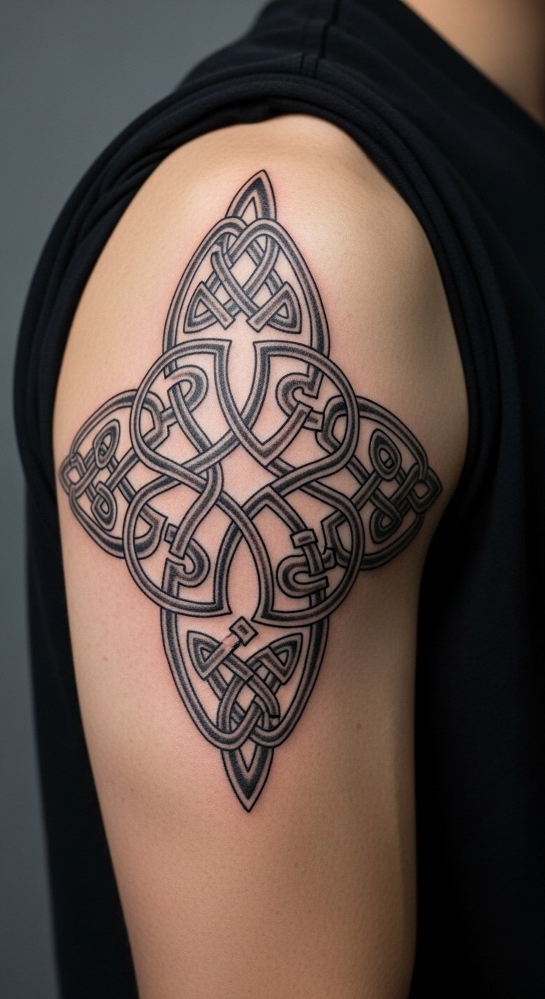 Celtic knots offer timeless loops on your upper arm. These patterns weave heritage into your style. Sketch knots from books or free sites. Online generators let you customize designs quickly. Expect $80–150 for a basic one nearby. Use bold lines to save on ink and keep it simple. Practice with string to understand the flow. Position for concealment under work clothes. Spread sessions out for comfort. Protect with daily creams you already own. This design stays meaningful and durable.