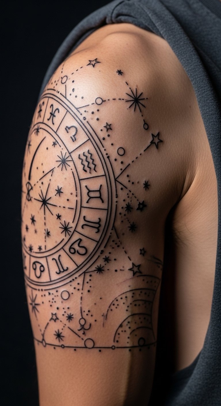 Zodiac signs bring subtle stars to your upper arm. Pick your sign for a personal touch. Use star charts online to sketch ideas. Free tools let you arrange them easily. Budget $70–130 for this at a shop. Opt for fine lines to keep it light on the wallet. Test with a pen drawing. Place where it stays covered at work. Break into short visits. Moisturize with home items to keep lines sharp. This design feels personal and fades slowly.