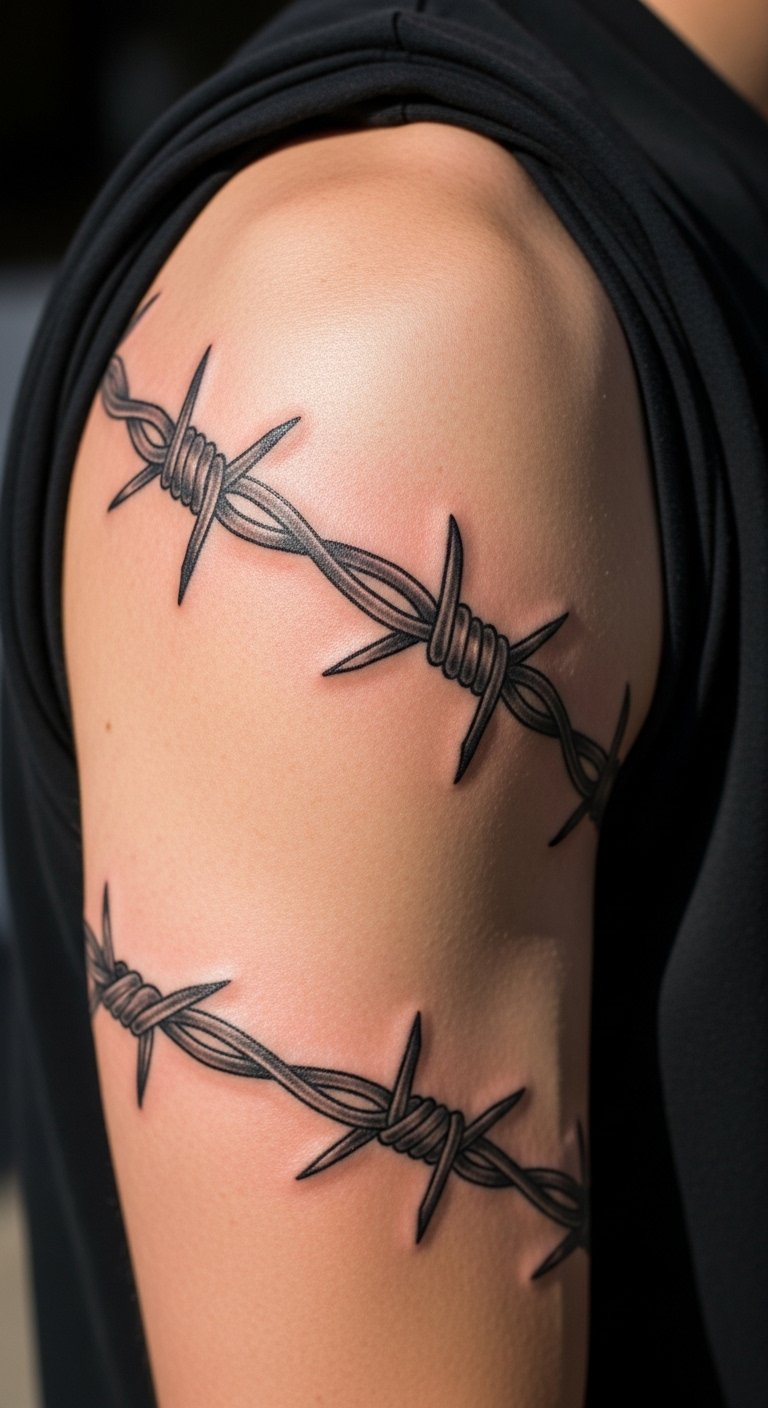 Barbed wire adds edge to your upper arm. This design twists around for a tough look. Draw from fence images online. Quick tools help refine it. Expect $80–140. Go with straight lines. Try with markers. Hide for work. Short appointments work. Maintain with creams. It stays bold.