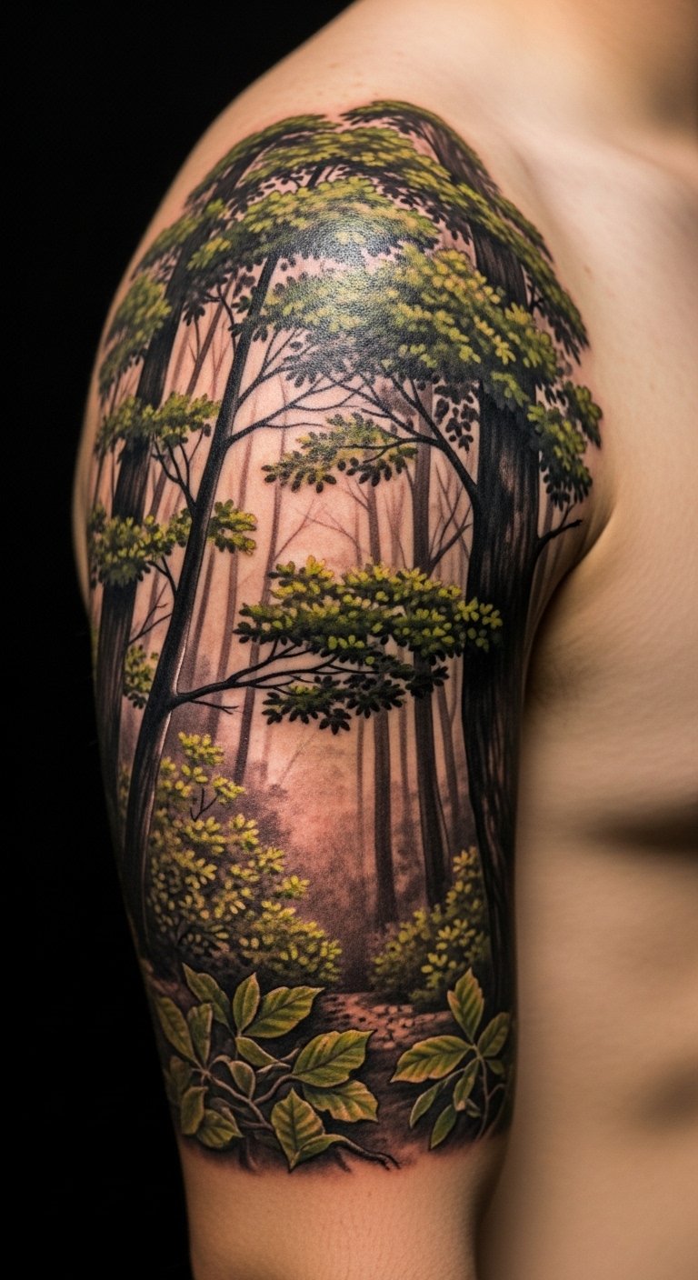 A forest scene brings woods to your arm. Trees and leaves create a mini landscape. Use nature pics to sketch. Free software assists. Budget $110–190. Pick layered shades. Preview drawings. Cover for events. Phased sessions. Protect from sun. This design grows with you.