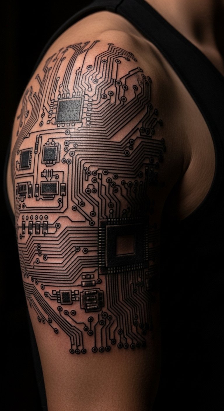 Circuits wire your arm for tech style. Lines mimic boards and chips. Sketch from device images. Free tools build it. $90–160. Keep lines clear. Marker tests. Work cover. Brief sessions. Cream maintenance. Tech forward.