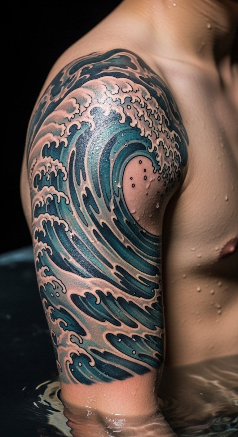 Waves crash on your upper arm. This design flows with movement. Use sea photos to start. Free apps refine. $90–170. Wave lines easy. Test drawings. Sleeve cover. Phased work. Sunscreen use. Ocean feel.