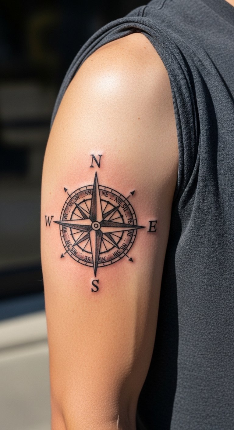 A compass rose guides your arm. Points and lines show direction. Sketch from maps. Online tools free. $70–130. Simple points. Paper plans. Hide option. Quick sessions. Lotion keeps. Direction inspired.