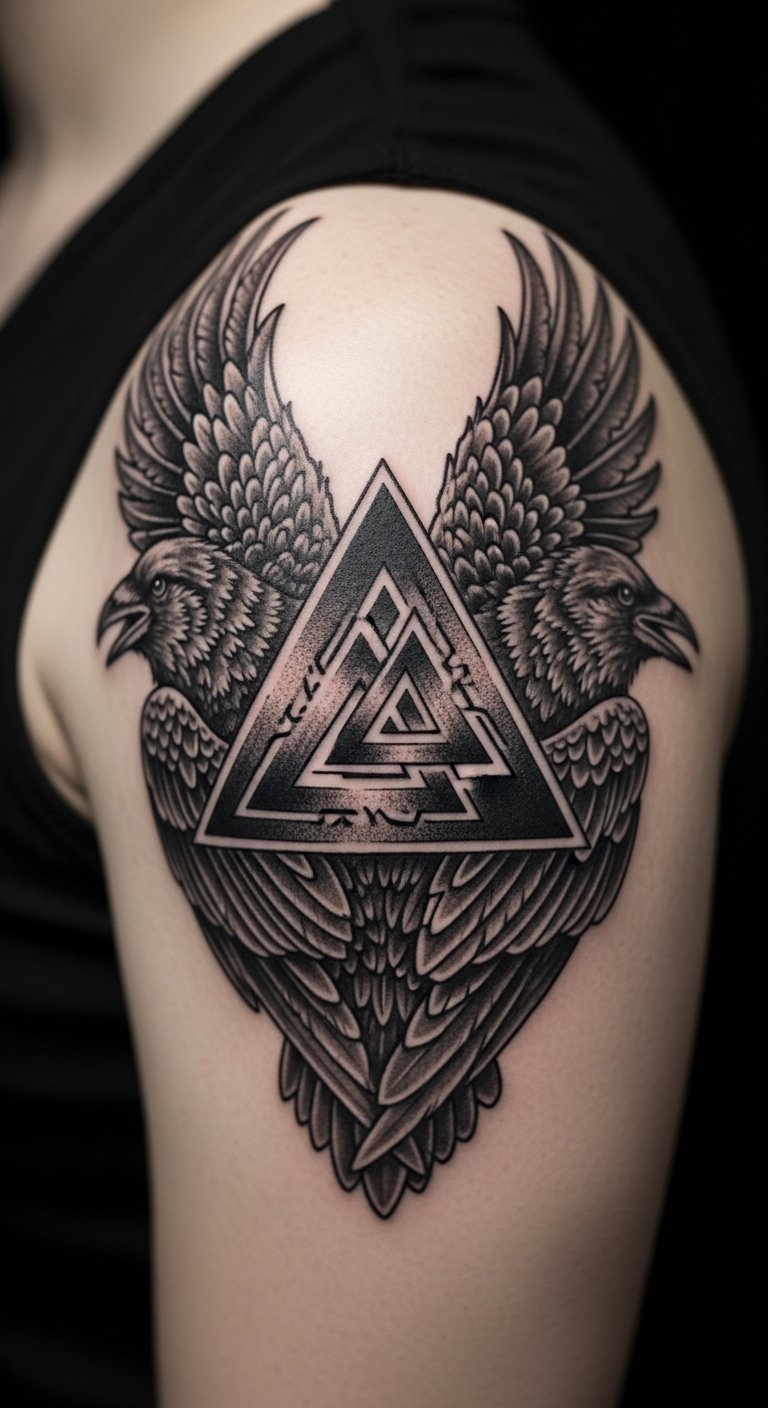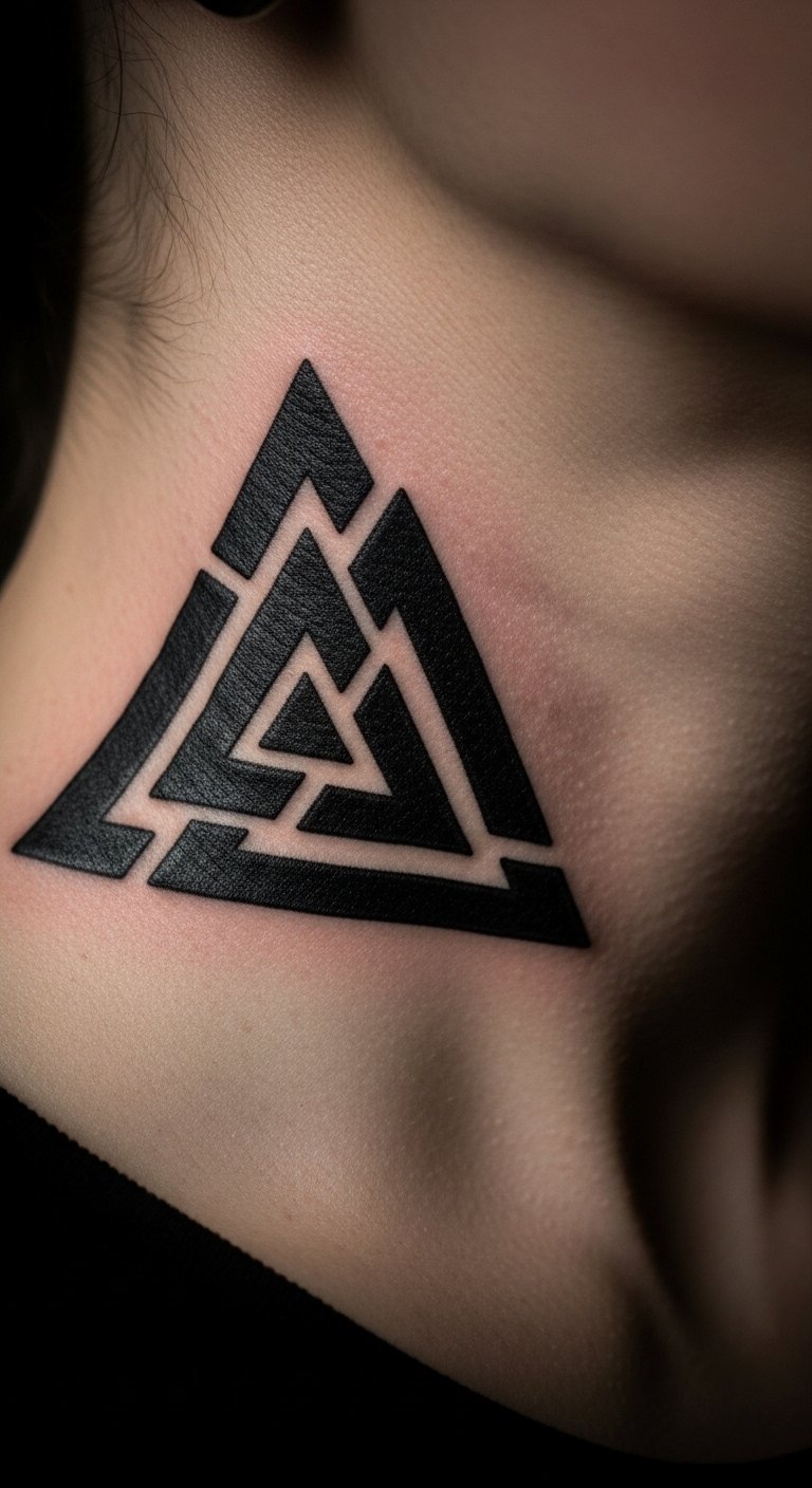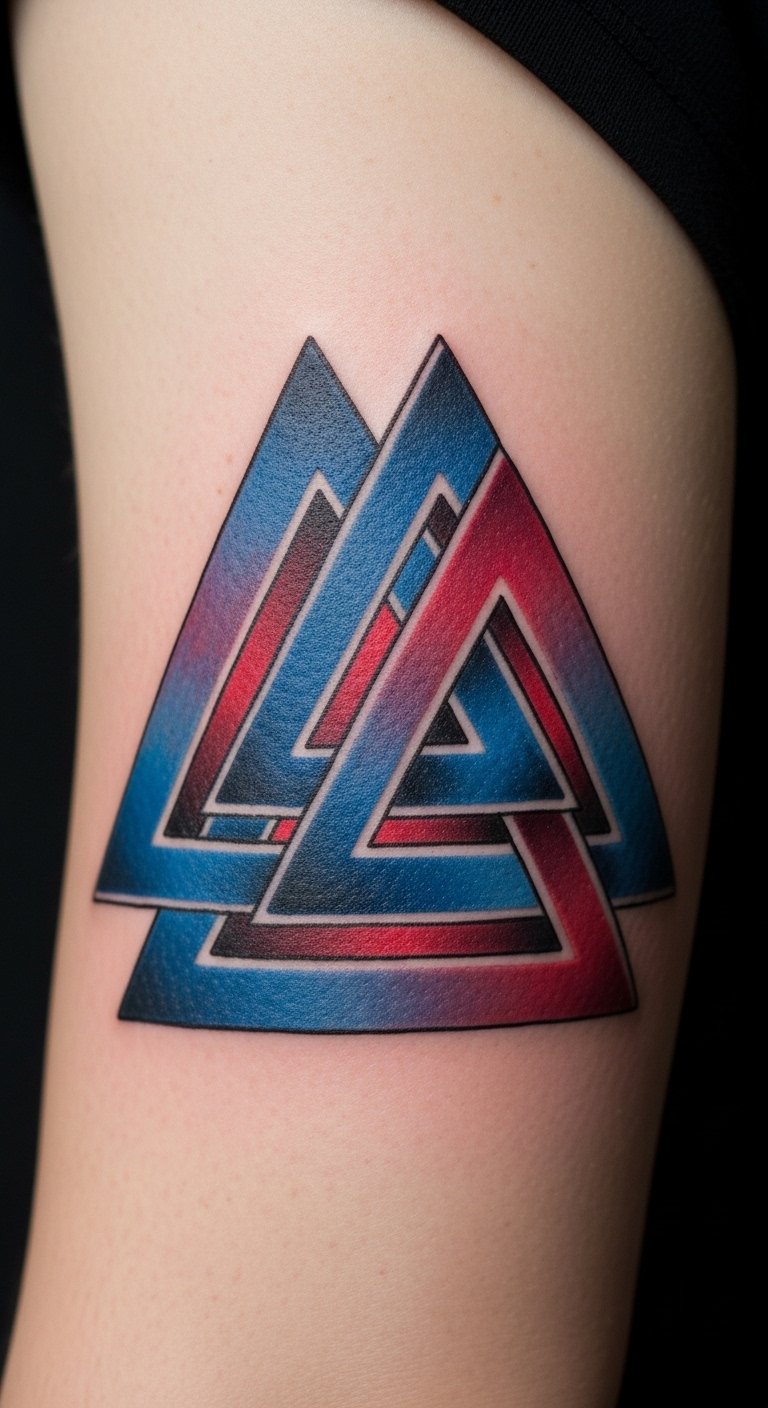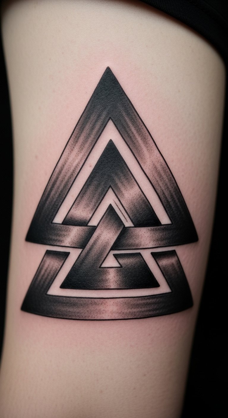 Twist Valknut with geometric elements. Add angles to triangles. Rulers aid drawing. Find at home. Geometric stencils are budget finds. Apply and adjust. Choose shoulder for flow. Look for creative artists. Keep variations simple.