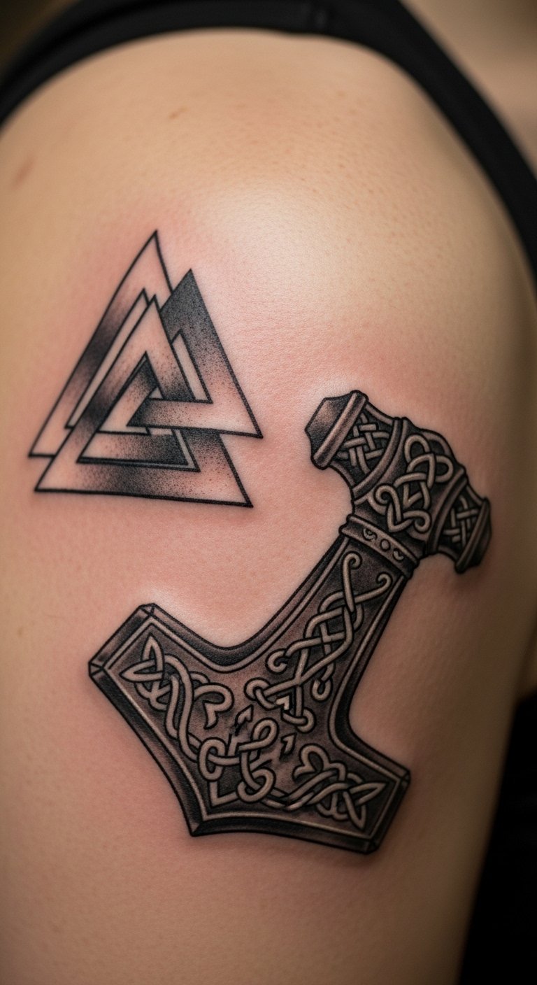 Combine Valknut with Thor’s hammer. It adds warrior vibes. Draw both symbols together. Start with pencil sketches. Practice on fabric scraps. Get hammer stencils for under $3. Try them on your shoulder. Choose a design that fits the curve. Artists often have templates ready. Ask for bundle deals. Keep colors basic to cut costs. This tattoo reminds you of protection.