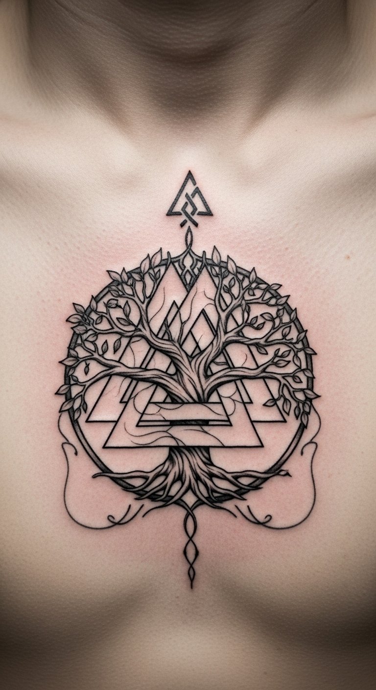 Link Valknut to the Tree of Life. Branches from triangles. Sketch branches simply. Tree templates online. Under $2. Place on chest for meaning. Find deals on combos. Let it grow your story.