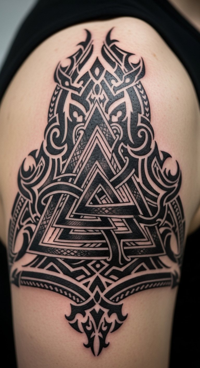 Fuse Valknut with tribal patterns. Add edges to shapes. Tribal drawings practice. Freehand at home. Tribal stencils cost little. Place on shoulder strongly. Look for fusion experts. Keep patterns bold.