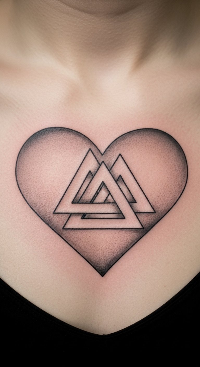 Shape Valknut like a heart. For love themes. Heart drawings start. Simple tools. Heart stickers test. Place on chest warmly. Artists do custom work. Let it hold affection.