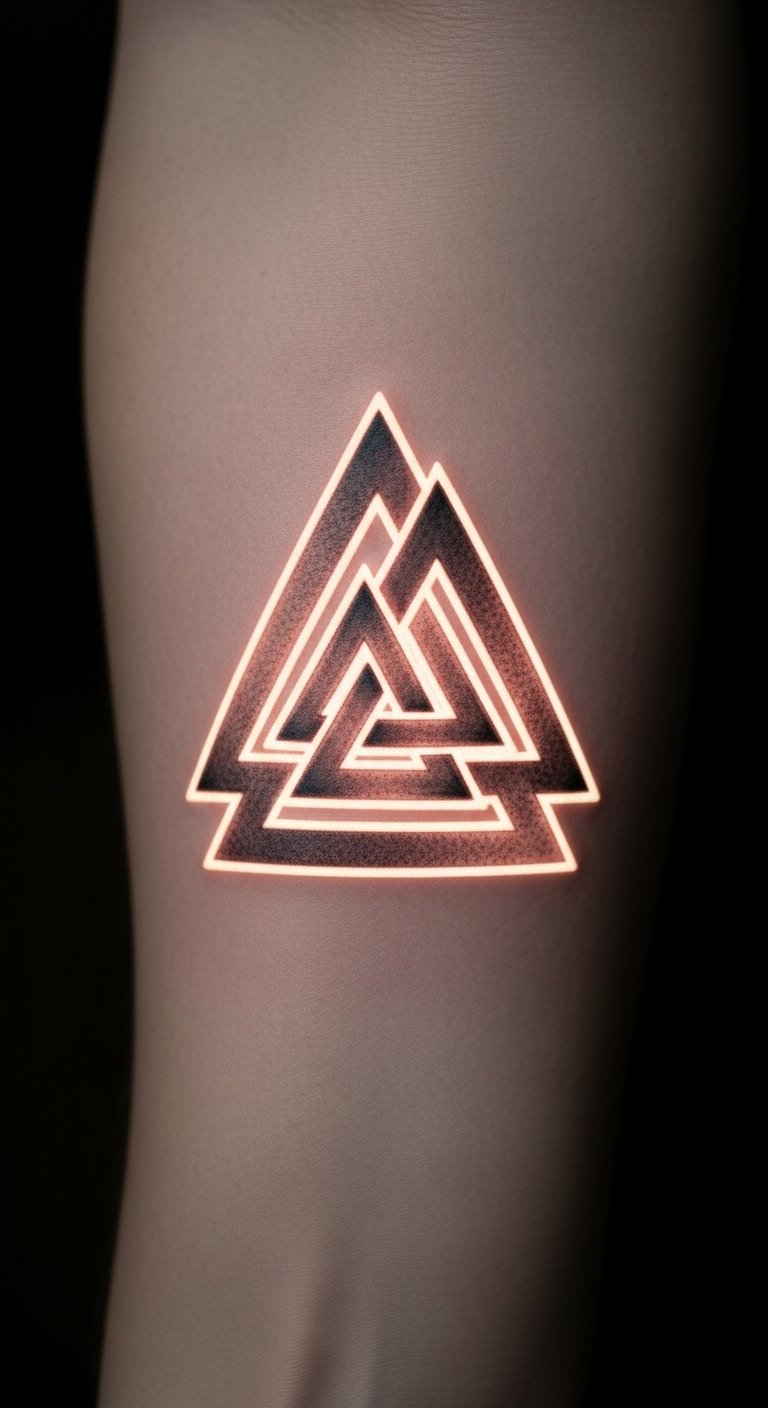 Add glow to Valknut. Shade for light effects. Glow markers sketch. Fun at home. Glow transfers experiment. Put on forearm brightly. Opt for shading tricks. Make it shine your way.