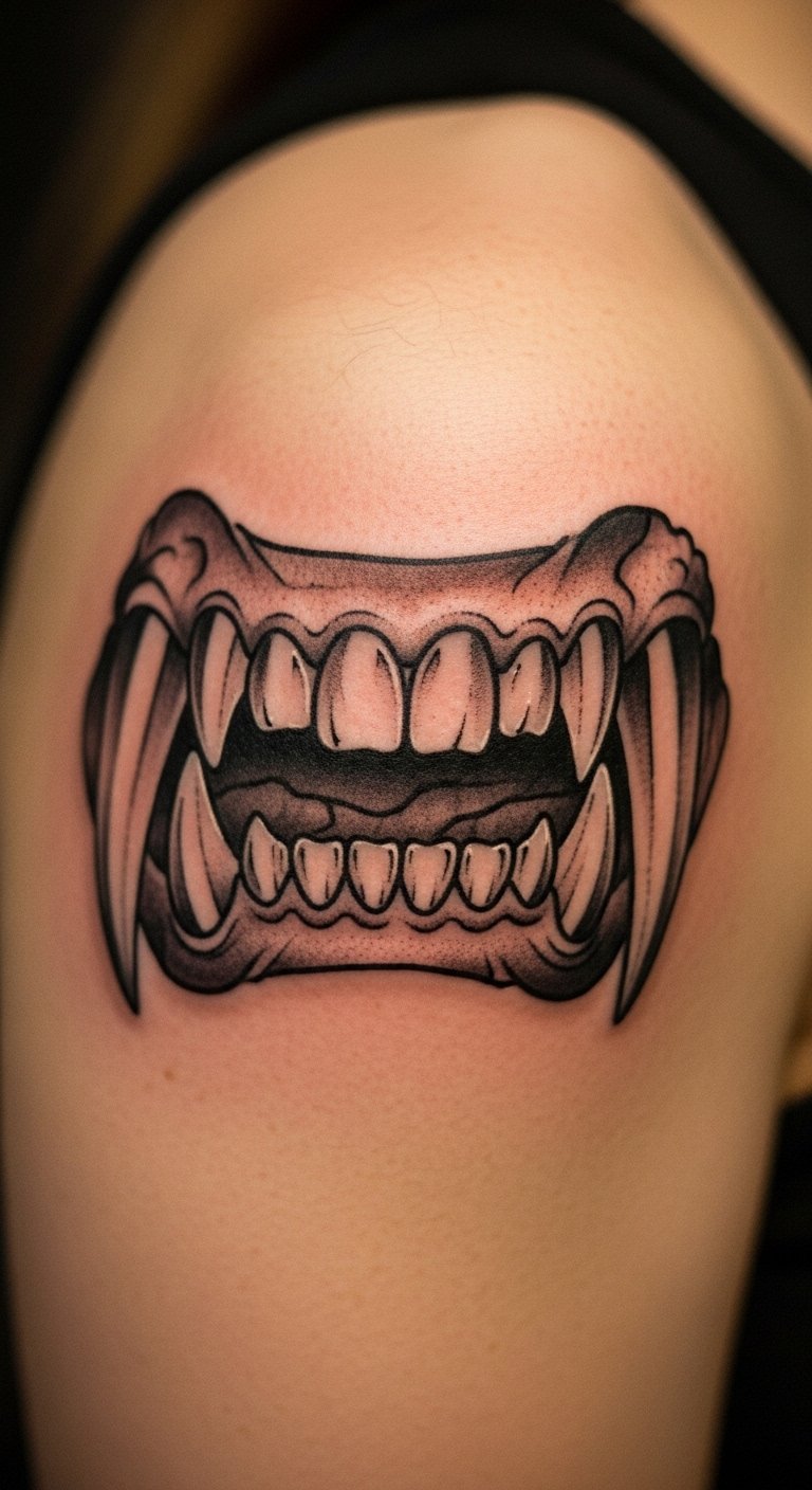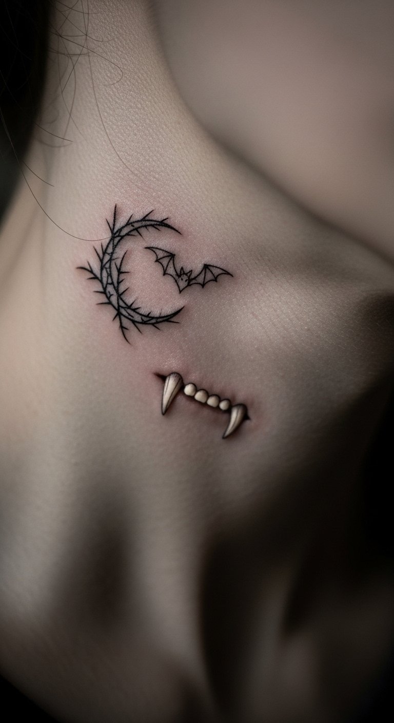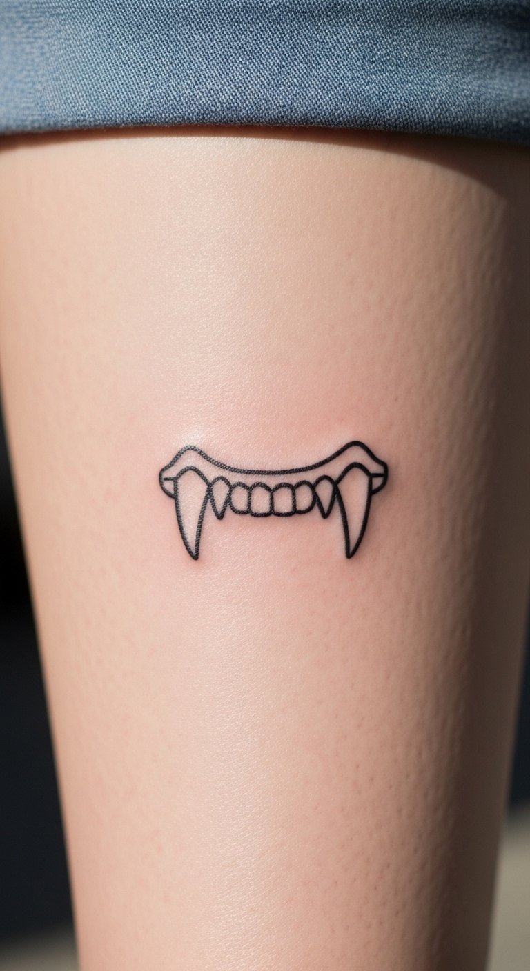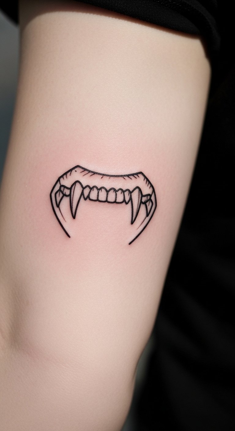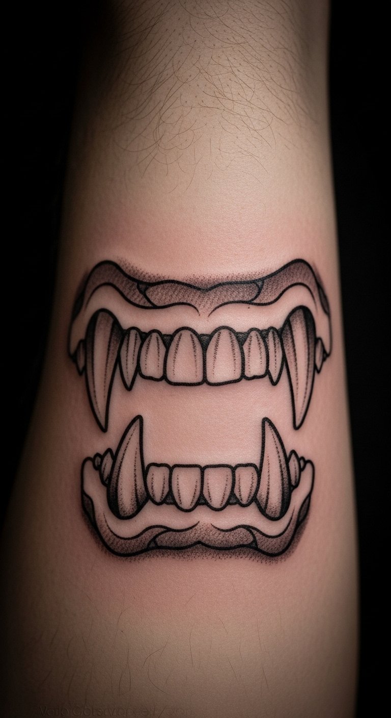 Think about starting simple. A fangs outline captures the essence of vampires without overwhelming your style. This design uses just a few bold lines for a clean look. Easy to hide or show off. Want to try it affordably? Sketch it on paper first with a black pen. Practice drawing fangs to get the shape right. For a budget option, use temporary tattoo kits from online stores—under $10. Apply one on your arm to test it out. Mix in red marker for a pop of color. Keep it personal by adding a small twist, like a tiny bat nearby. This way, you build confidence before committing. Real talk: tattoos last forever, so pick a spot like your wrist for easy viewing. Go for local artists who offer consultations. They might have portfolio photos to inspire you. Simple actions like this make tattooing fun and low-risk.