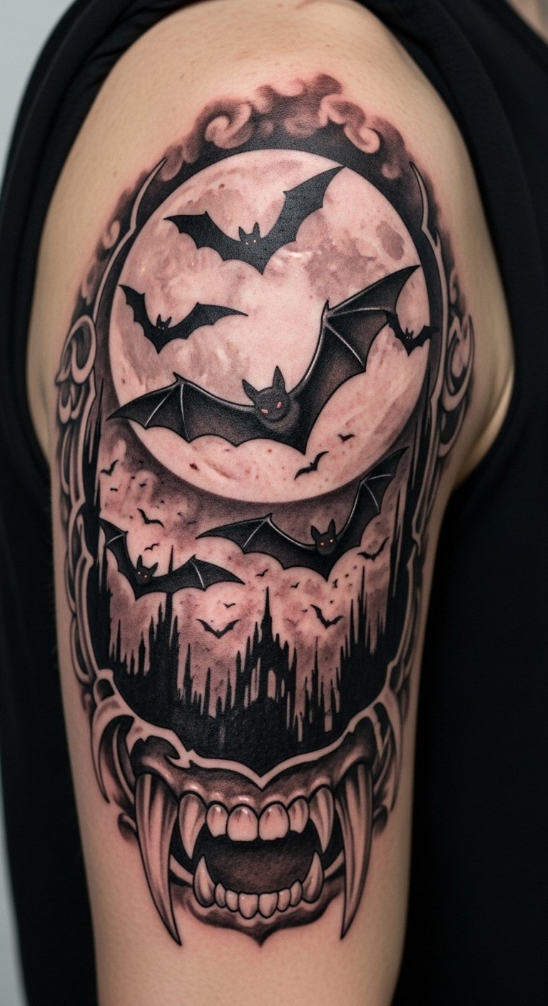 Build a scene up top. Bats and fangs create atmosphere. Layer drawings at home. Use old photos for ideas. Place on your bicep for strength. Temporary sets help visualize. Keep it thematic with additions.