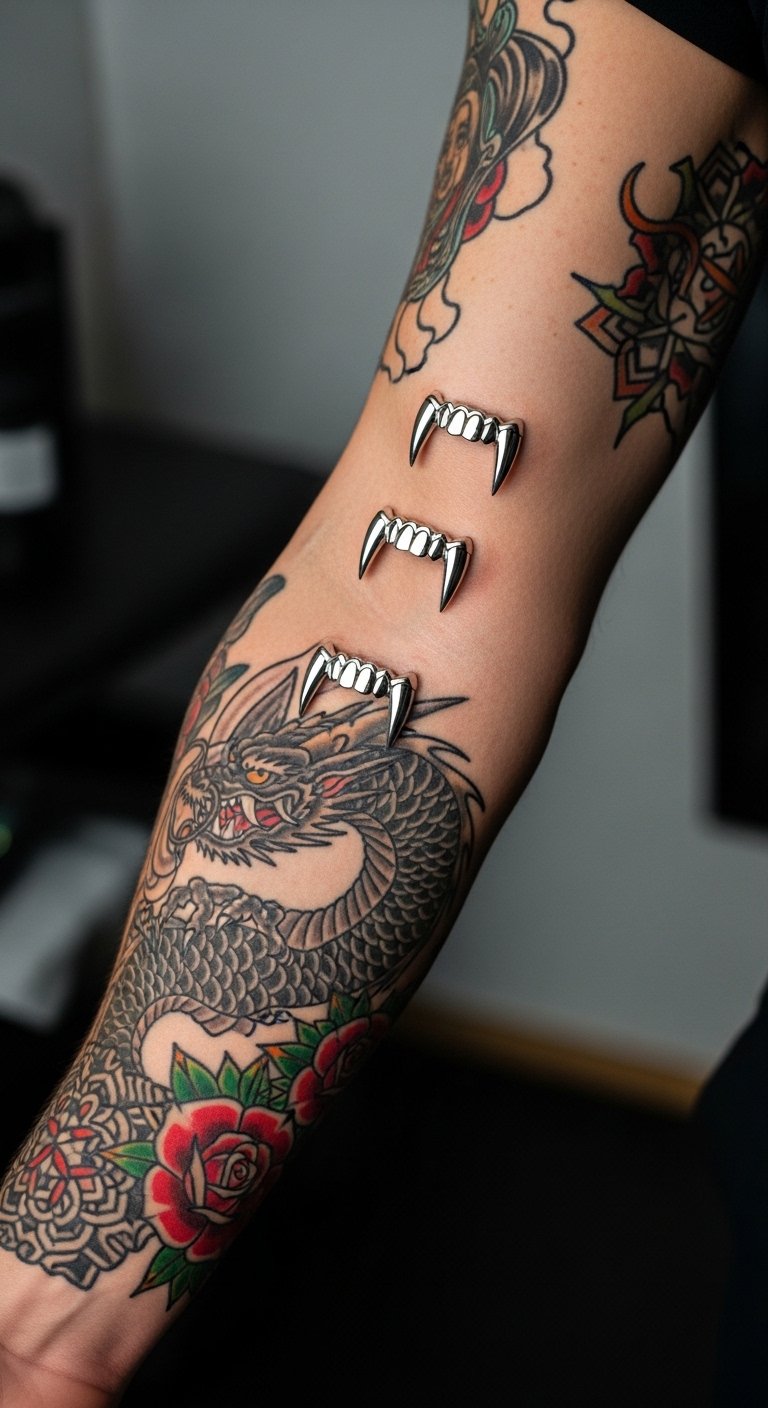 Forearms offer prime real estate. Fangs here are easy to see. Measure space with tape. Practice with henna kits under $5. Position for balance. Add extras like veins. This spot works for daily wear.