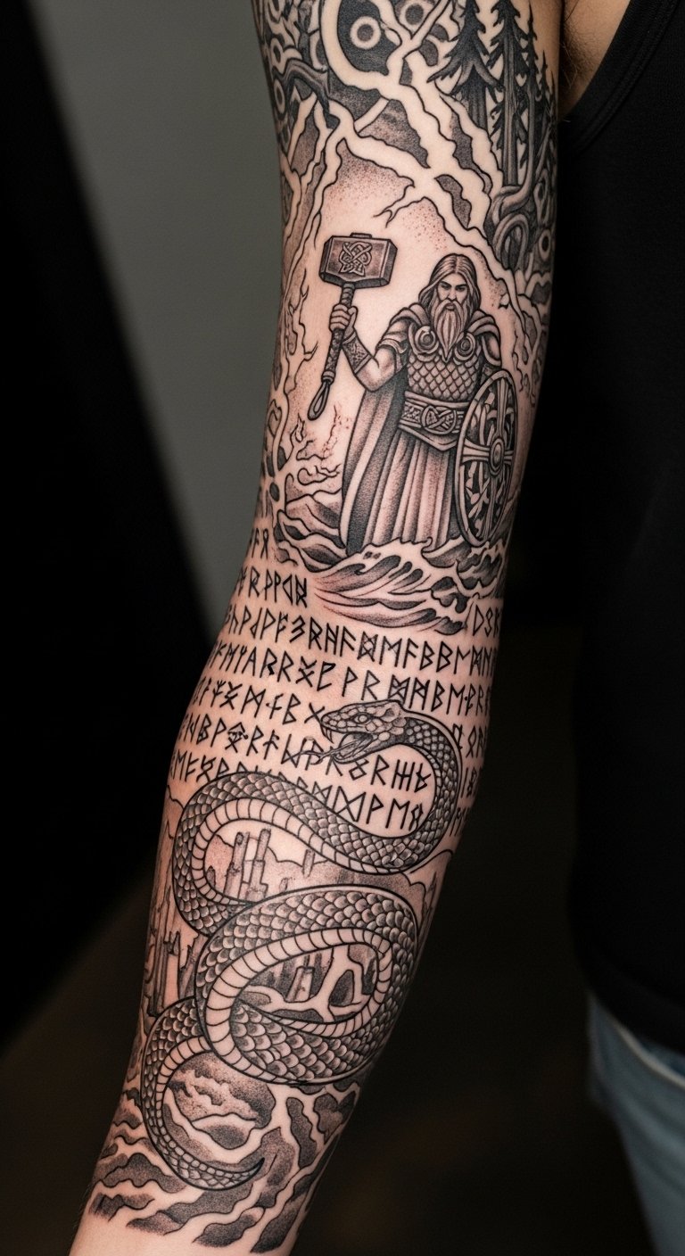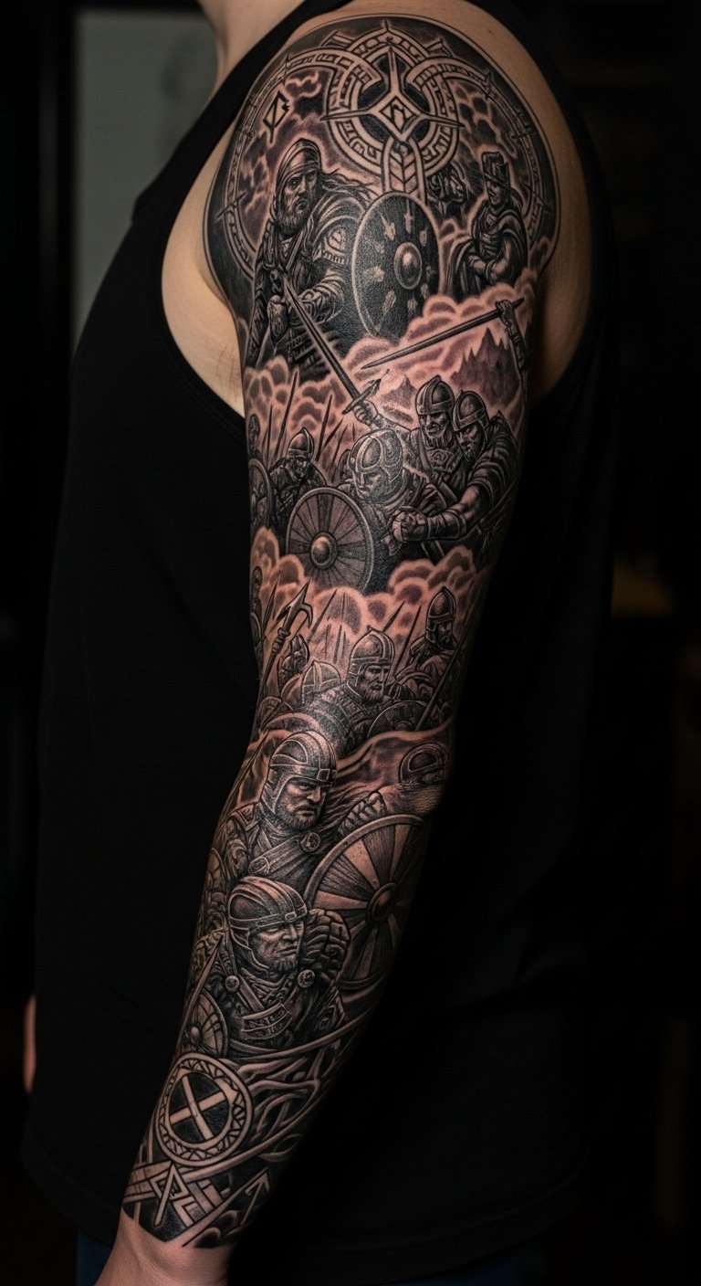 Ragnarok scene depicts epic fights. Envision it on your sleeve for drama. It tells a tale. Sketch scenes. Get for $190. Use story lines. Add details. This makes it epic. Size appropriately. Heal with care. Let it excite. Put on arm. Find inspiration. A narrative design thrills. It stays vivid.