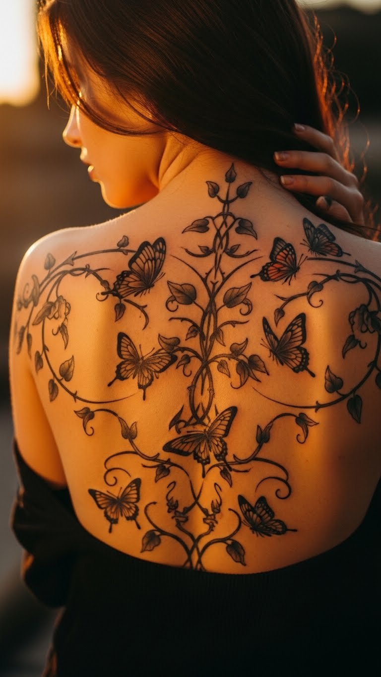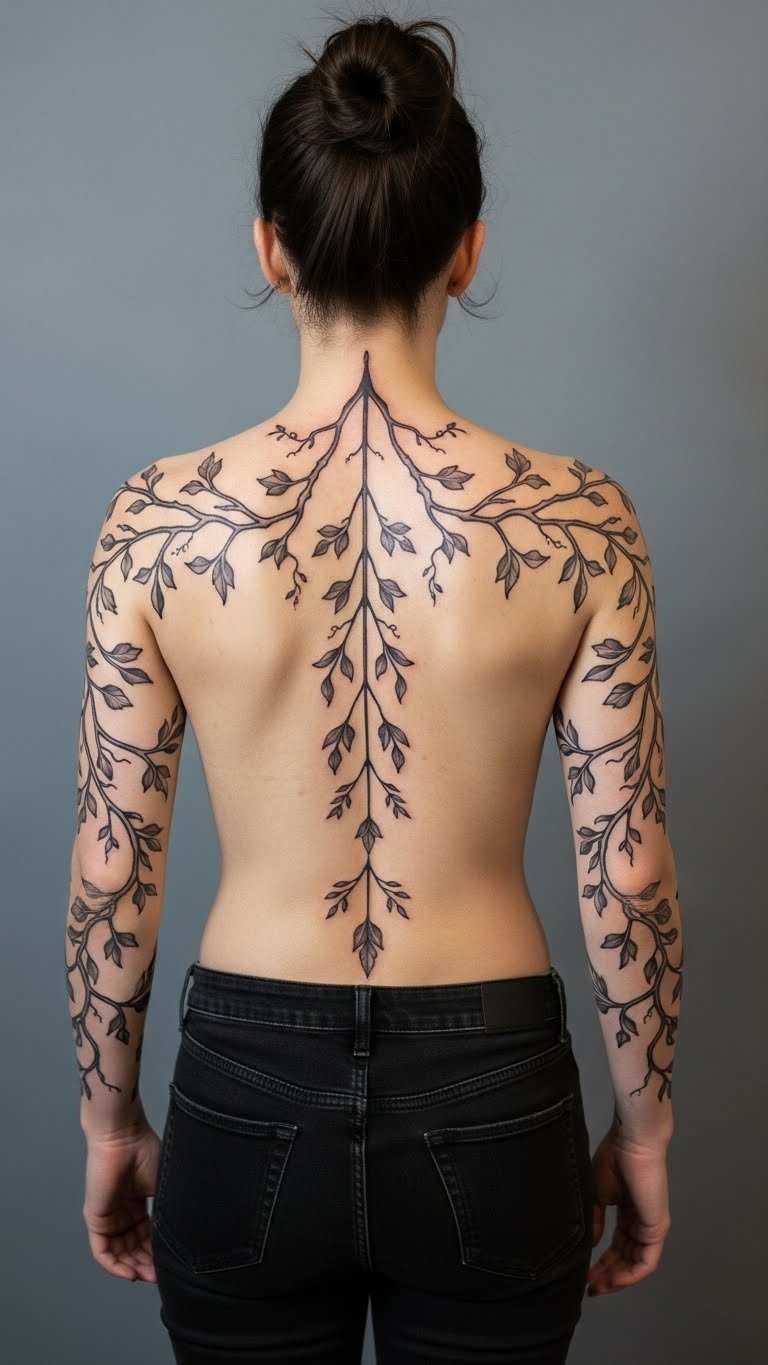 See vines covering your whole back for a grand statement. It’s powerful and immersive. Use body paint from a dollar store to preview. Temporary full-back stickers cost about $10. Cover the entire back if you’re bold. Search for experienced artists; prices vary from $300 up. Customize with patterns that reflect your journey. Divide the process: design first, then sessions. Moisturize regularly for best results. Pair with simple outfits. Try this if you’re ready—it’s a big step but doable.