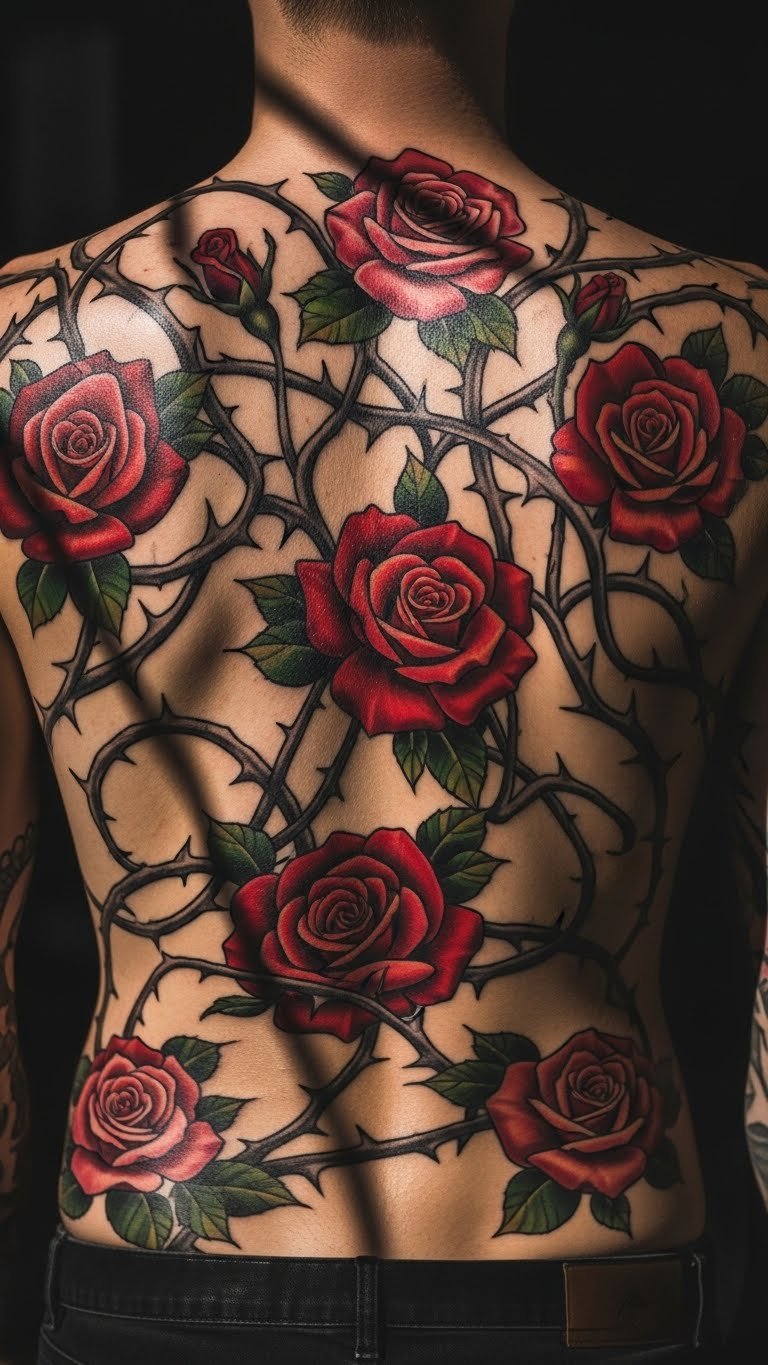 Imagine a vine with sharp thorns weaving across your back for an edgy vibe. This style says strength and protection. Draw it out with a free app on your phone to visualize. Try a temporary tattoo sticker for under $5 to test the look. Pick a spot near your shoulders for easy hiding. Find an artist through social media reviews; some charge around $150 for small pieces. Add thorns sparingly for a personal touch, like marking tough times. Plan ahead: pick your design, get feedback from friends, then book. Use a good moisturizer post-inking to keep it fresh. Pair it with casual outfits for surprise reveals. Jump in when it fits your budget—start small and build from there.