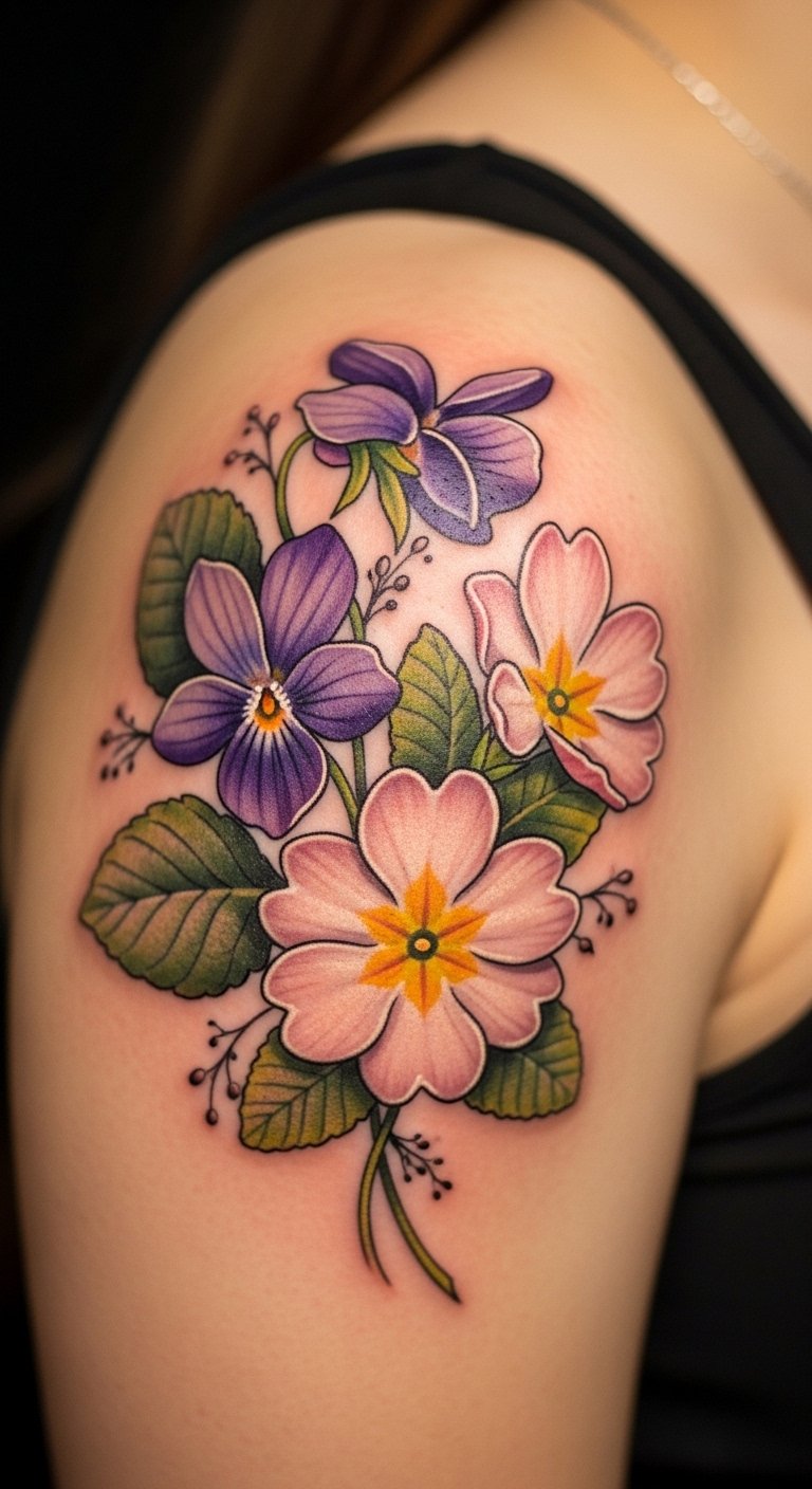 Pair violet with primrose on your shoulder for a story of youth and loyalty. Envision two flowers linked together, representing new starts and bonds. Experiment at home by combining sketches from free online images. Look for affordable artists who specialize in combos, often for $150–250. Place it on a spot that flexes with you, like the shoulder, for a dynamic look. Keep designs symmetric to balance the ink. This tattoo suits anyone chasing fresh vibes, and you can add a personal touch with a small twist in the petals. Show it off at gatherings to spark conversations about your journey.
