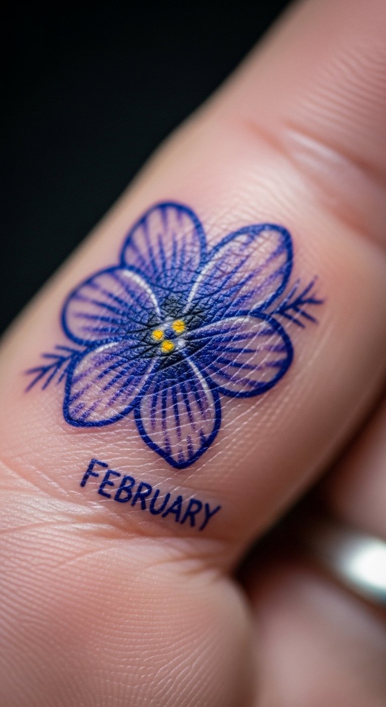 Mark February as your birth month with a violet on your finger for subtle pride. See it as a tiny bloom that whispers modesty and wisdom. Begin with quick sketches using household items like markers. Find budget-friendly finger tattoos at walk-in shops, starting at $50. Put it on a less painful spot, like the side, for easy sessions. Customize by adjusting the size to fit your style. This design pops with rings or alone, making daily tasks more meaningful. Use it as a personal emblem, reminding you of roots without overwhelming your look.