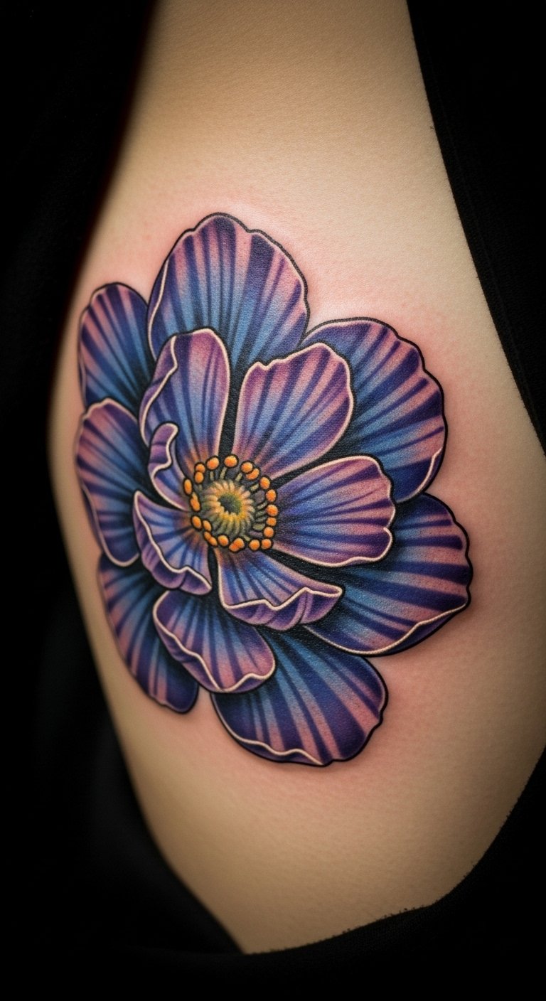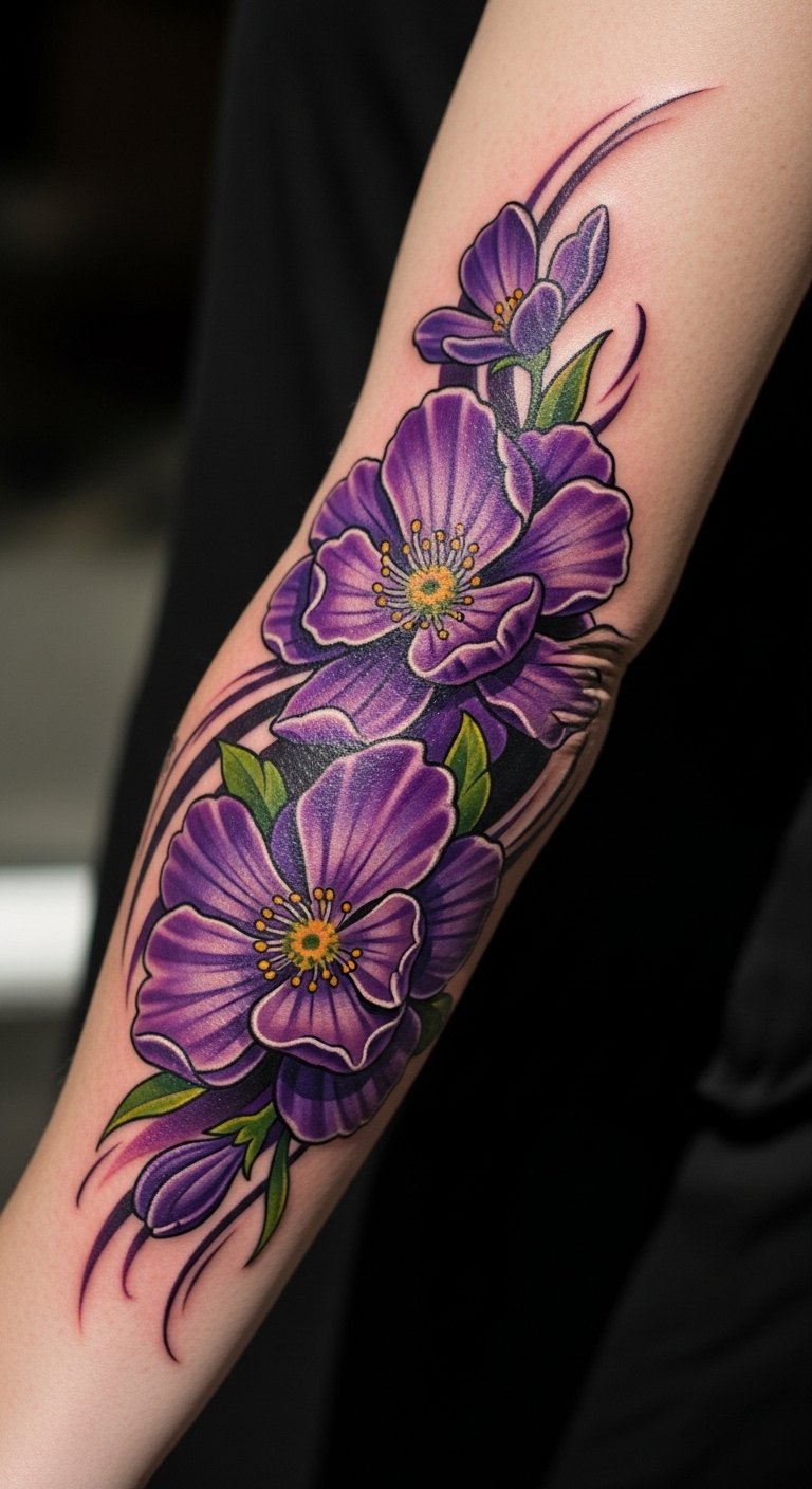 Kick off a sleeve with a vibrant purple violet for energy and hope. Imagine it as the first piece on your arm, building a bigger story over time. Practice by drawing on your skin with washable pens from home. Save by getting just one flower done first, around $100–200. Choose an area that flows with your movements for a natural fit. Add colors that match your wardrobe to make it versatile. This tattoo grows with you, so plan additions later. Wear long sleeves to protect it initially, turning your arm into a gallery of renewal.