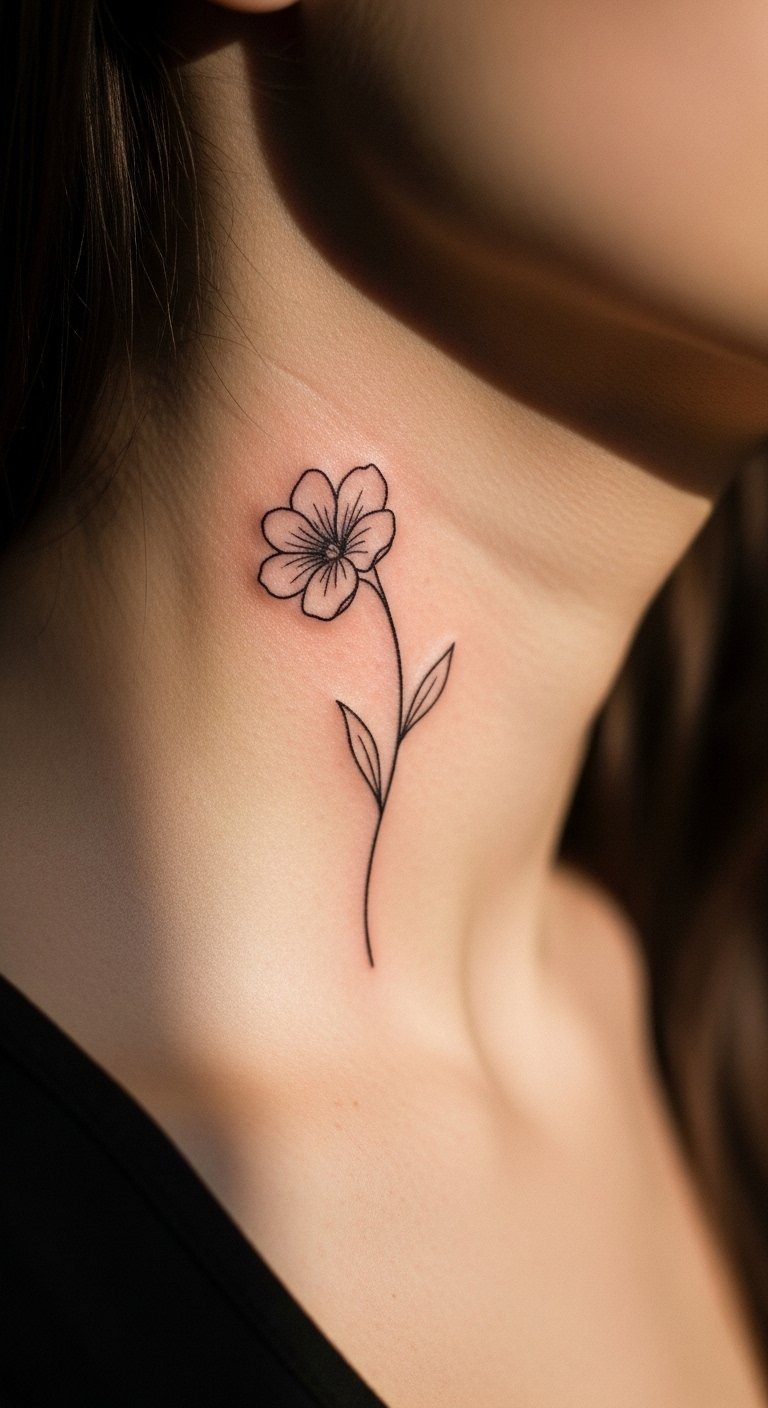 An outline violet with a stem on your neck offers clean elegance. Picture it as a discreet mark near your collar, standing for inner peace. Start sketching with paper and pencils you already have. Opt for quick sessions at local spots, costing less than $150. Place it low to cover with scarves if needed. Modify the stem length for your taste, keeping it straightforward. This design suits professional settings, peeking out just enough. Use it to honor quiet moments, blending into your neckline seamlessly.