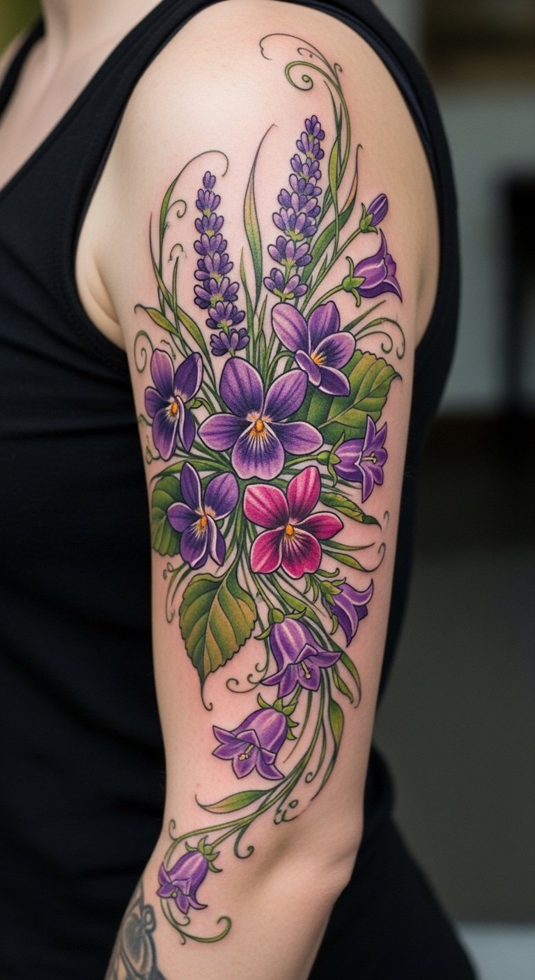 Wrap your arm in a violet bouquet for a full, flowing design. See it as a collection of blooms that tell a tale of loyalty. Gather ideas from free bouquet photos and sketch them yourself. Choose package deals at tattoo places for savings, around $250. Position it to follow your arm’s shape for comfort. Mix in other flowers for layers without extra cost. This style stands out at events, making your arm a statement. Start small and build up over visits.