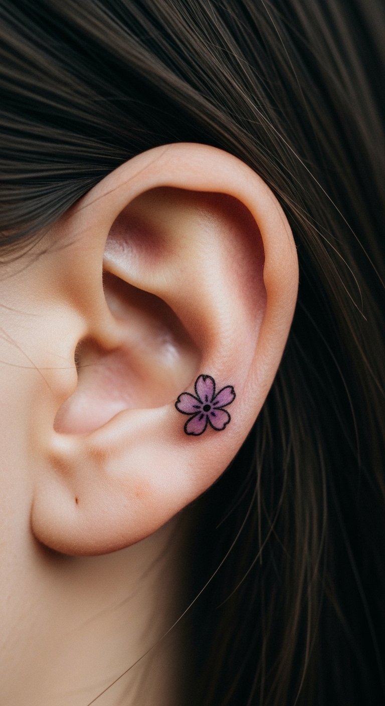 A small violet dot on your ear adds a hint of whimsy. Imagine a mini flower that fits behind your lobe, easy to ignore or admire. Draw dots with a marker to test ideas. Find ear tattoos for quick, cheap sessions, like $50. Put it on the outer edge to minimize discomfort. Customize with a single petal for uniqueness. This design pairs with earrings, turning your ear into a subtle showcase. Keep it simple for everyday wear.