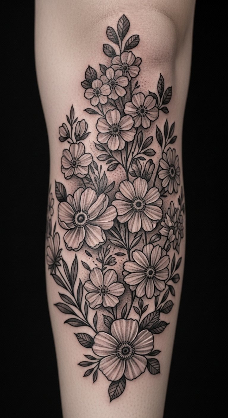 Go monochrome with a violet array on your leg for sophisticated vibes. Envision a series of gray blooms that climb your calf, nodding to remembrance. Experiment with gray scales using home art supplies. Look for multi-design packages to save, starting at $200. Place it along your leg for balanced coverage. Vary the sizes for interest without complexity. This tattoo works under pants, revealing when you want. Use it to mark memories in a timeless way.