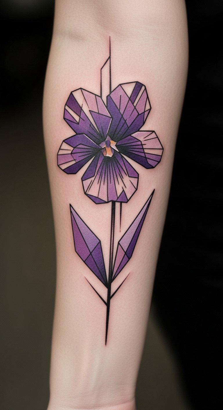 An abstract geometric violet on your forearm mixes art and flowers. Picture sharp angles forming a bloom, representing renewal. Try geometric drawings with rulers at home. Opt for modern styles at affordable shops, around $150. Put it on your inner forearm for easy viewing. Add geometric twists to make it yours. This design fits creative types, sparking talks about your interests. Cover it for work if needed.