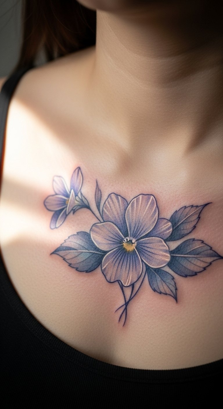 A violet for remembrance on your chest holds deep meaning. See it as a bloom over your heart, honoring lost ones. Sketch heartfelt designs with family photos as guides. Choose emotional pieces at local studios, costing $100–200. Place it centrally for personal significance. Keep details simple to focus on the message. This tattoo serves as a quiet tribute, visible when you share. Protect it during healing for lasting clarity.