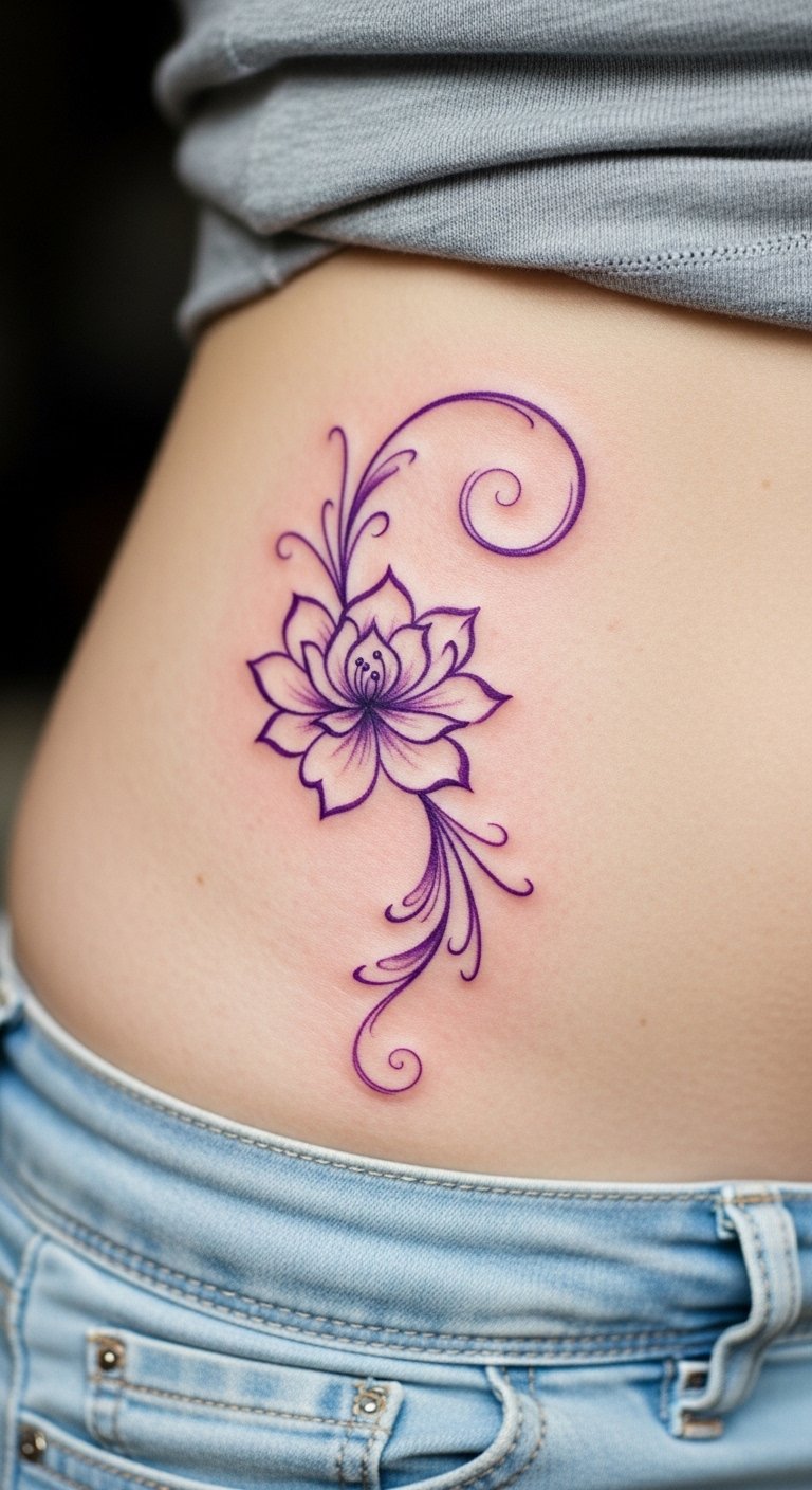 A feminine violet swirl on your hip brings graceful curves. Imagine swirling petals that dance with your movements, standing for poise. Practice swirls with freehand drawing tools. Find hip tattoos for sessions under $200. Position it to follow your hip’s shape for comfort. Personalize with extra loops for flair. This design empowers your stride, perfect for active days. Cover it as needed for versatility.
