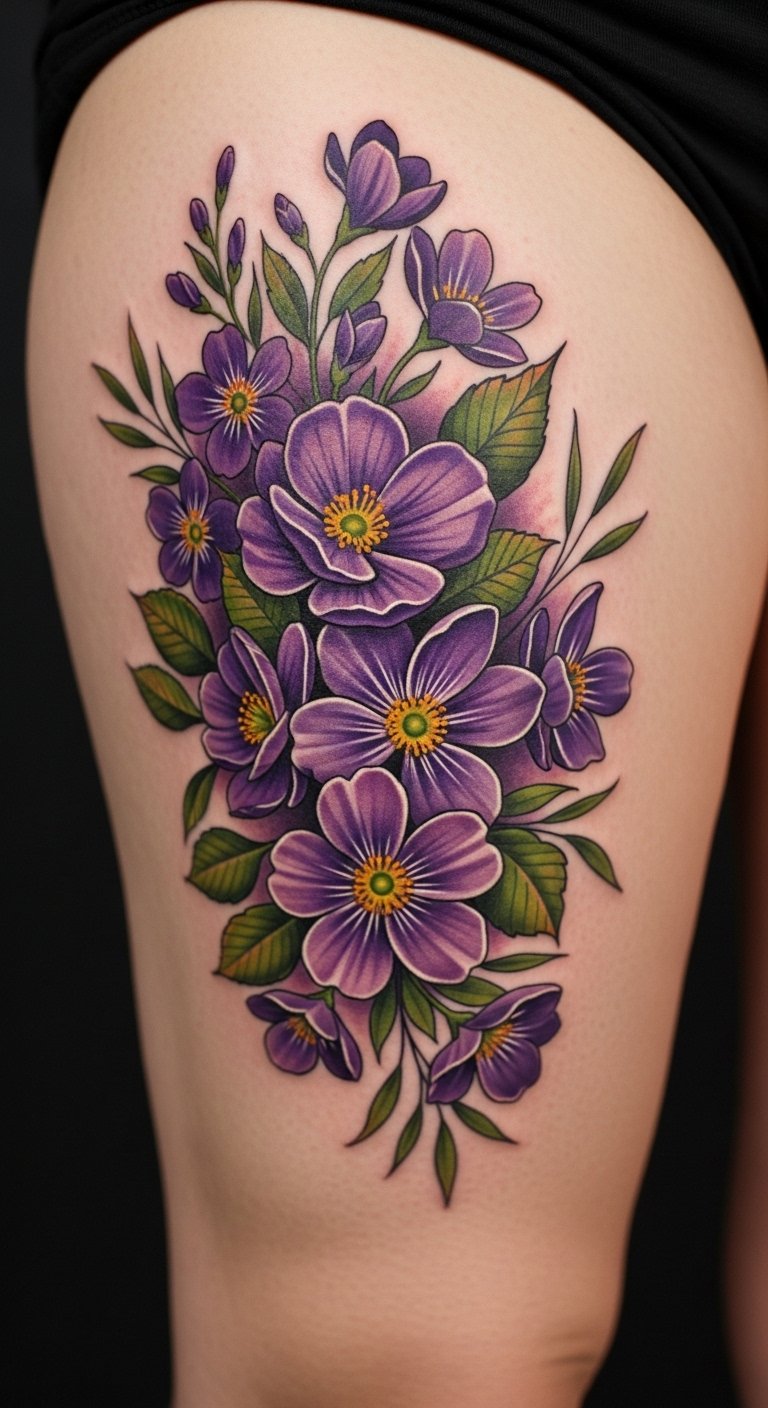 A multi-flower violet mix on your thigh layers meanings. Envision violets with other blooms, symbolizing bonds. Combine ideas from garden pictures and draw them out. Save by getting a set design, around $250. Place it on your outer thigh for easy access. Balance flowers for a cohesive look. This tattoo tells a story, ideal for sharing experiences. Start with one flower and expand.
